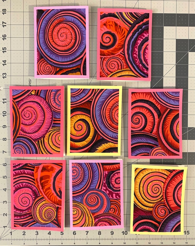 Then I remembered that I had some smaller colored cards that I had intended to paint on. These had been sitting in the closet unused for at least two years. These are about 4×6 inches… and I LOVE these fabrics on the colored cards!