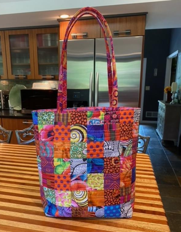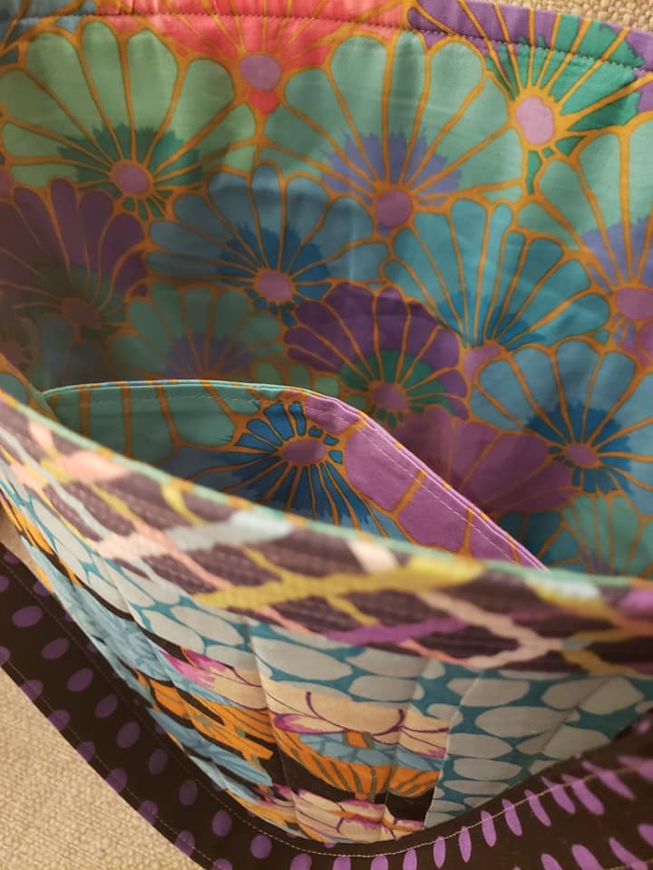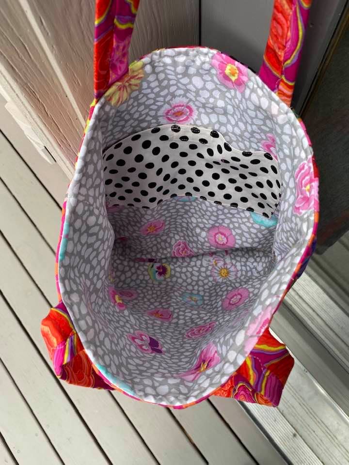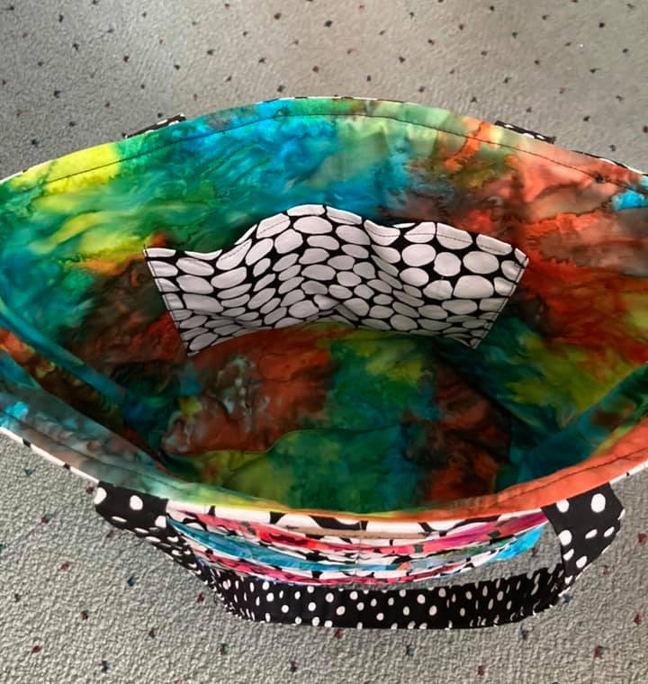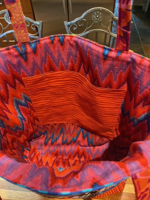 Next up is this bag made by Diane Levine and I just love it! It’s so fun to see others strike out and make what I had so much fun with. And look at her fun lining! It’s got all the colors of the fabrics on the front of the bag. So cute!