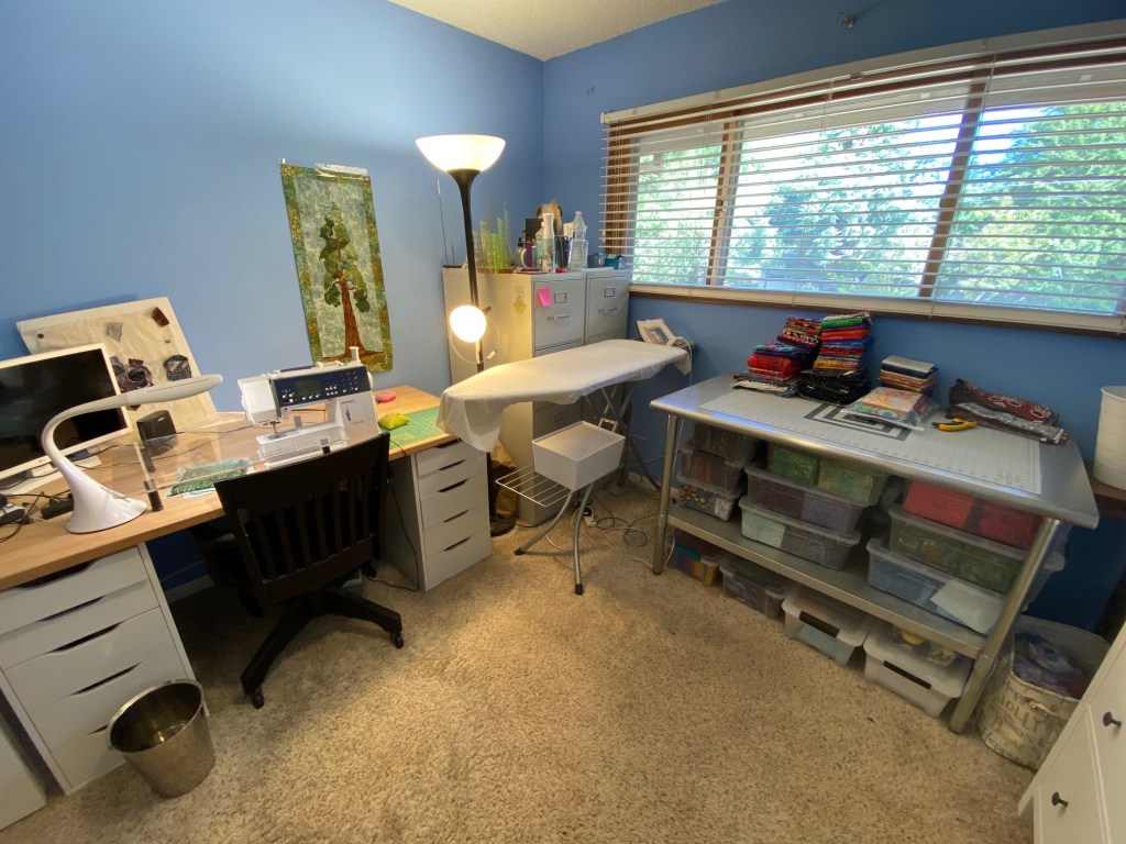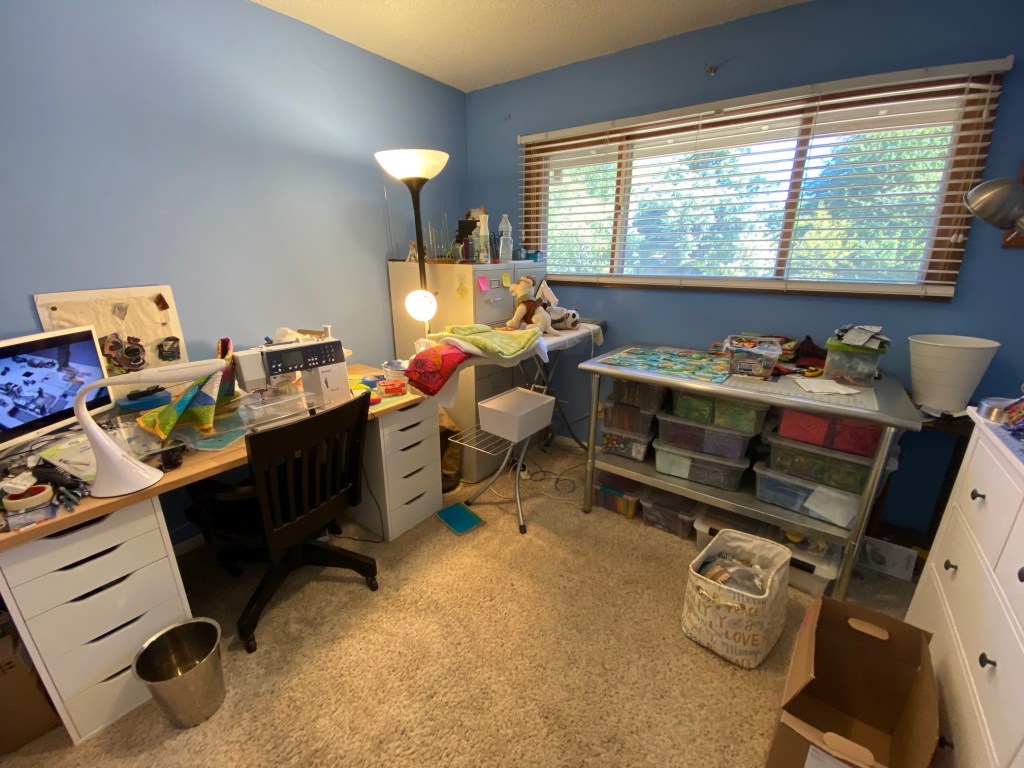 The final thing I did during my vacation was to organize and clean my sewing room. My neighbor is moving and has been getting rid of a lot of stuff. I’ve snagged a couple of storage pieces that helped in this organization project.