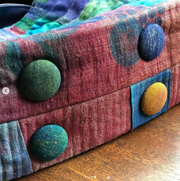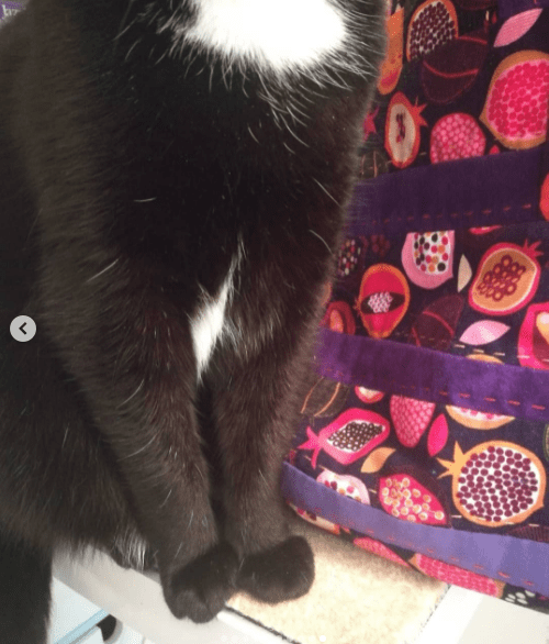The next bag was made by Eve Nicholls. She made this all with hand sewing. It’s made from figgy “needle cord,” or a fine wale corduroy as we Americans call it. Not only is it hand sewn, but it’s hand quilted too. I think that cat might be as impressed as I am!