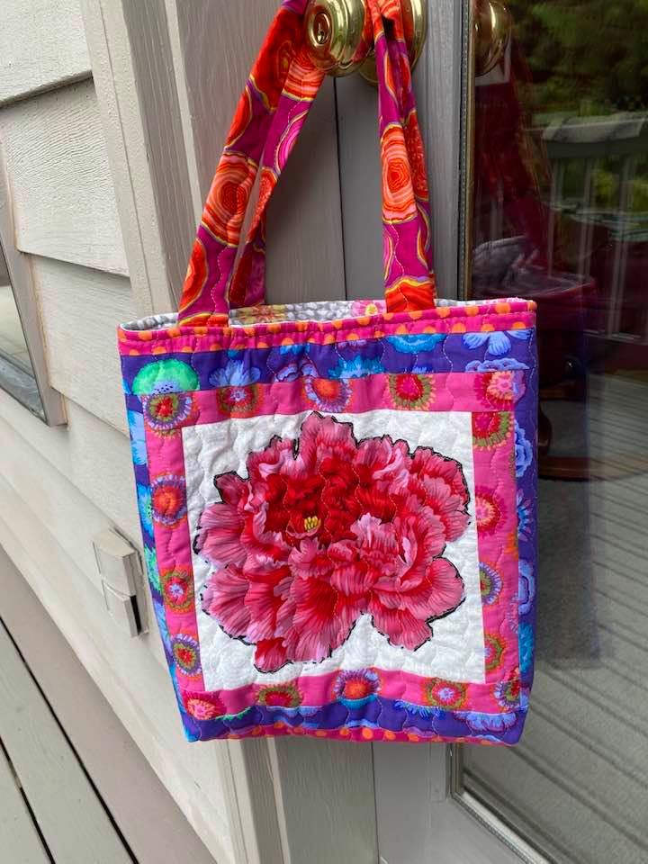 This next one was made by Linda Allen. She appliqued that great big bloom on the front of the bag! It’s so much fun with the scrappy treatment on the back of the bag. And that lining… well, it’s one of my favorite fabrics and it’s great as a lining!