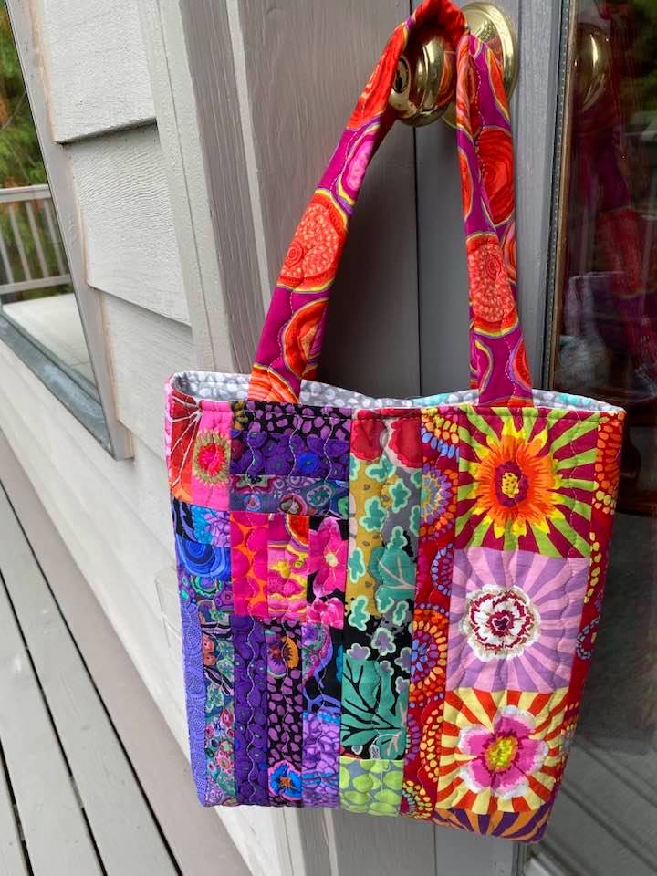 Next up is this bag from Jacqueline Frances. I just love the diagonal lines on this bag and the colors are so bright and fun. And that lining is one of my favorite Kaffe fabrics.