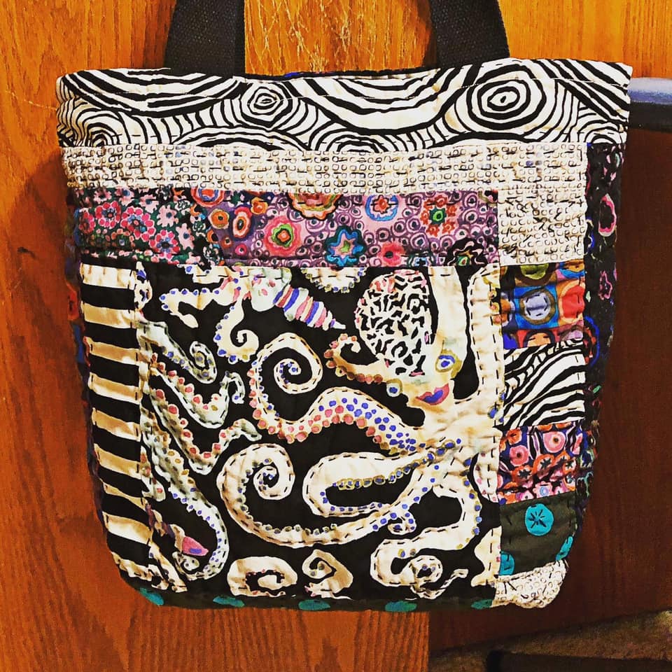This next bag was made by Susan Marocco and it’s so much fun! I just love the way she used that octopus fabric! It’s so organic and the movement is amazing! I’ve been wanting to use some octopus in a Frankenbag, and now I’m sorry Susan beat me to it! And if you look closely, you’ll see a lot of hand quilting is this bag too. What a fun bag!!! And all kinds of ideas are flying around in my head!