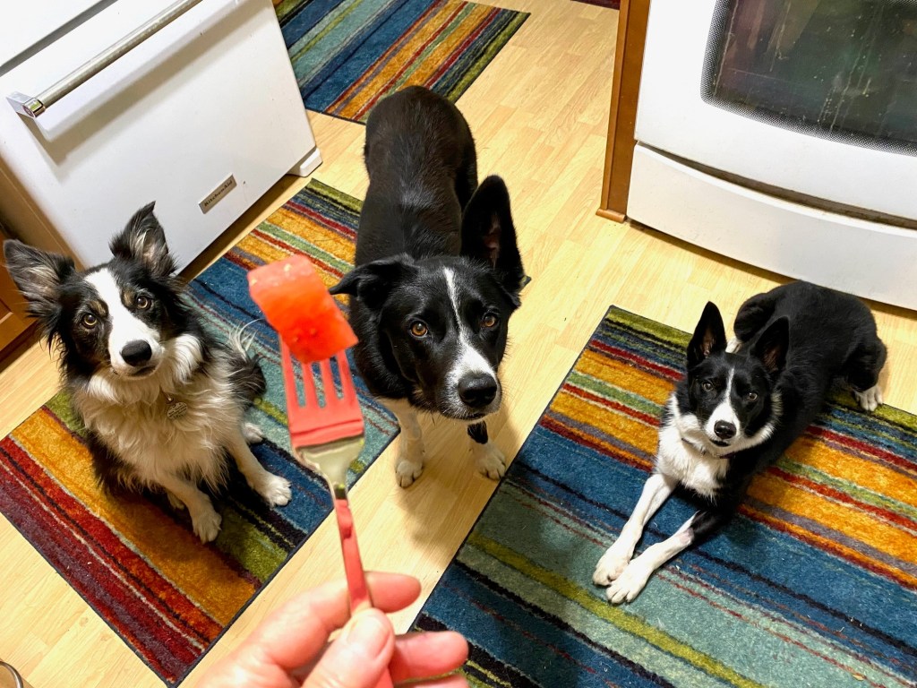 Jolene is a teeny tiny border collie and is a very nicely trained sheep dog. She looks like a chihuahua next to Rico! She gets along amazingly well with my boys since they do know each other quite well. They all enjoyed some watermelon after dinner.