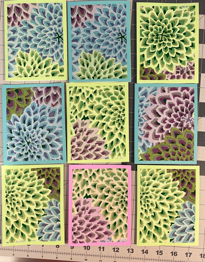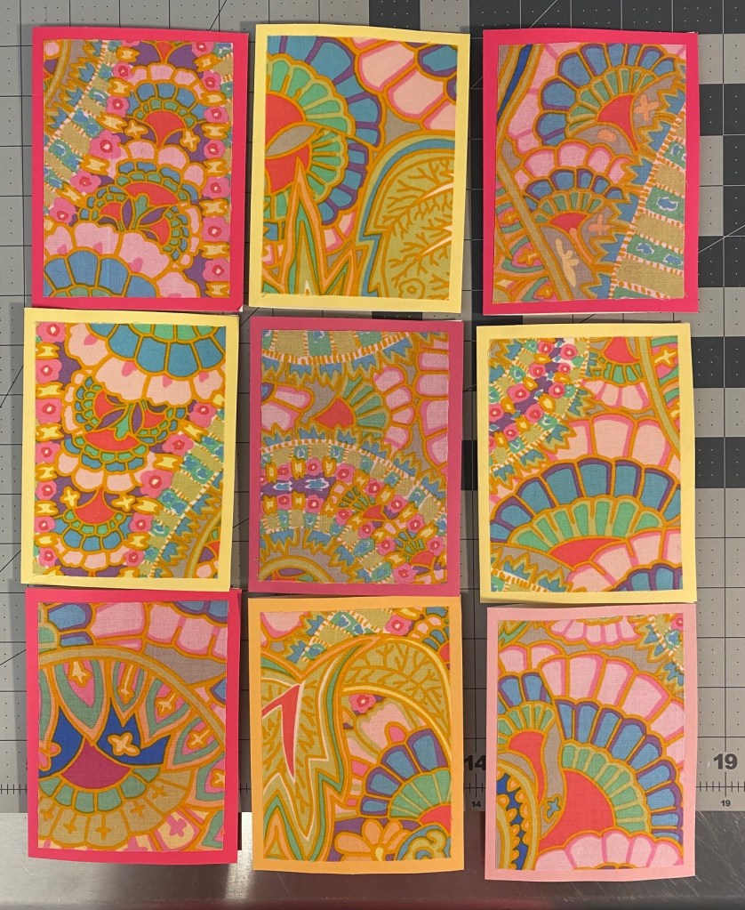 At the end, I wound up with about 20 blank cards that were pink, yellow and orange. So I dug into my stash and found a piece of fabric that worked with those colors: Kaffe’s Belle Epoch in yellow. Look how different all these cards are! It’s so amazing!