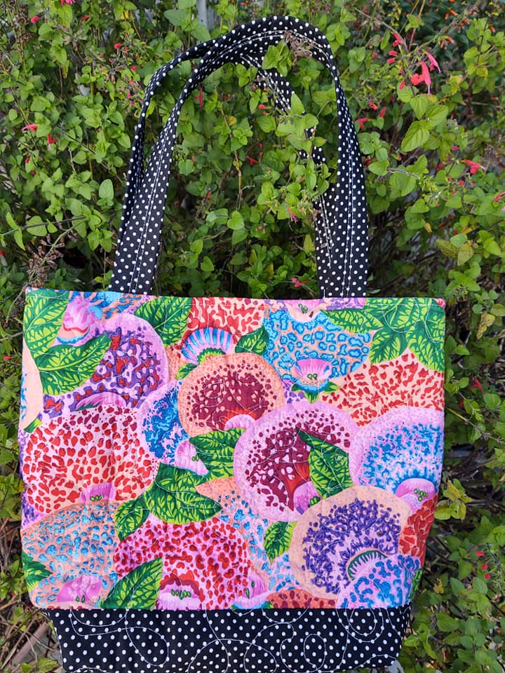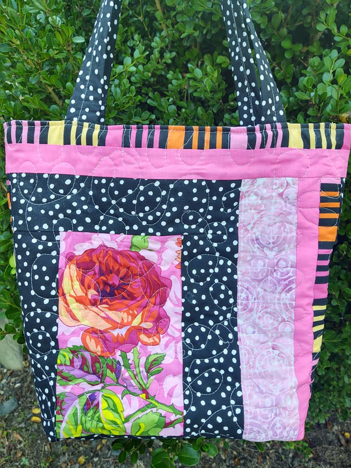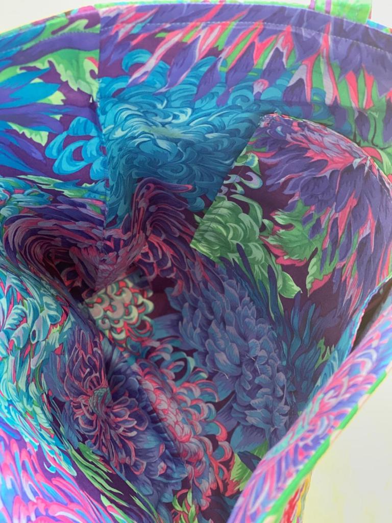 This next bag was made by Sharon Pepping. She said she couldn’t decide what color way to use for her bag, so she made each side a different color! It’s like having two bags!!! You can carry it and show which ever side makes you happy! I love her fabric choices and I love all that saturated color!