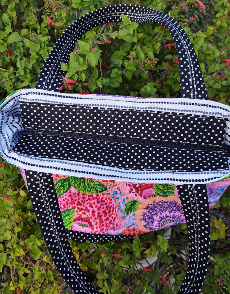 Next is this bag made by Rayna Lusby. I love the way she used those big blooms, and that black and white swirly fabric at the top of the bag and on the handles is so wild! I love it! And I have to say, I really appreciate it that everyone is really going for it with their linings! Look at how this one just makes this pretty bag sing!
