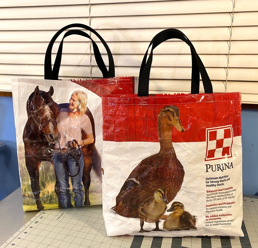 And because I don’t do anything half-assed, I put out the call on Facebook that I was looking for empty feed bags and my friends really came through in droves. I think I must have at least 40 feed bags in my garage — horses, chickens, pigs, goats, sheep, and more chickens and more horses. Some really fun and colorful designs.