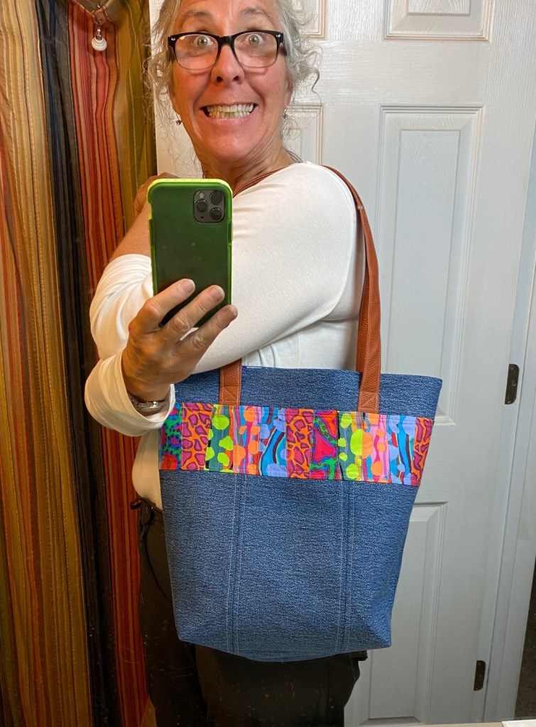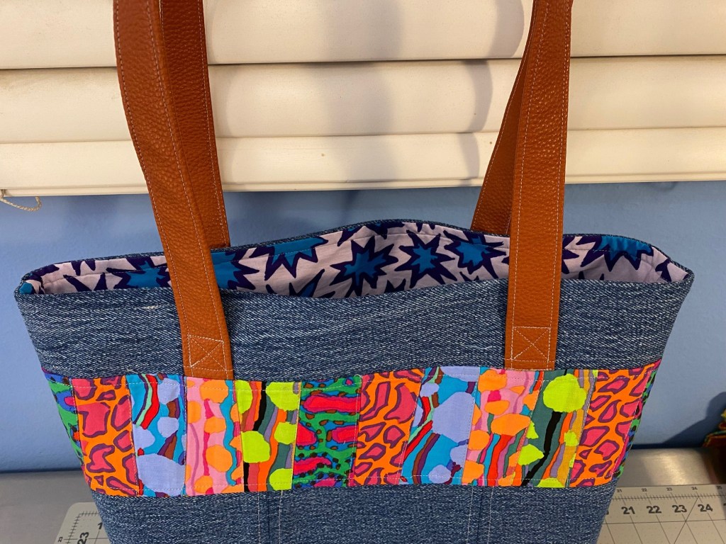 I didn’t have much to do to finish this denim bag with some fun Brandon Mably fabrics so I dug in after dinner and our evening walk and finished it up.