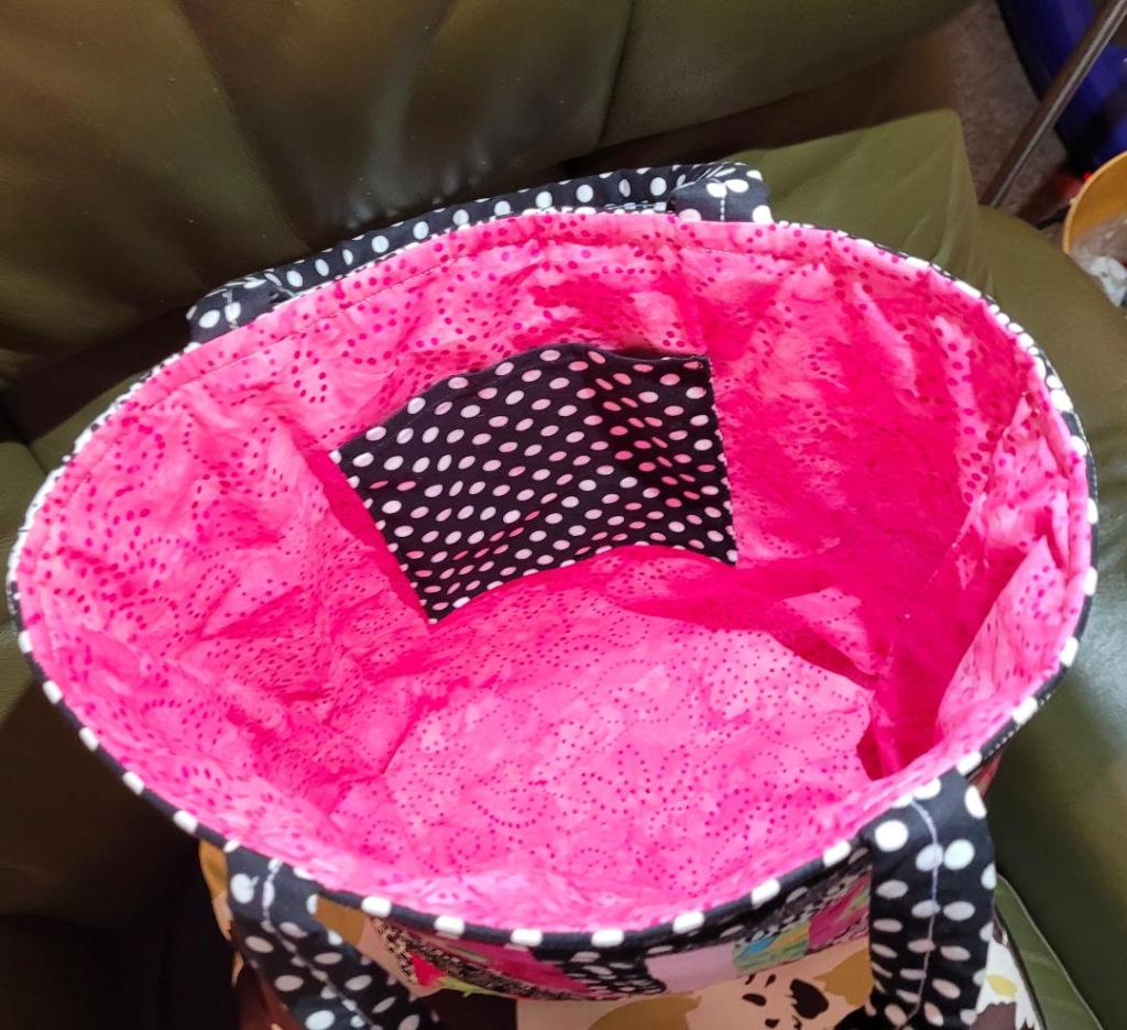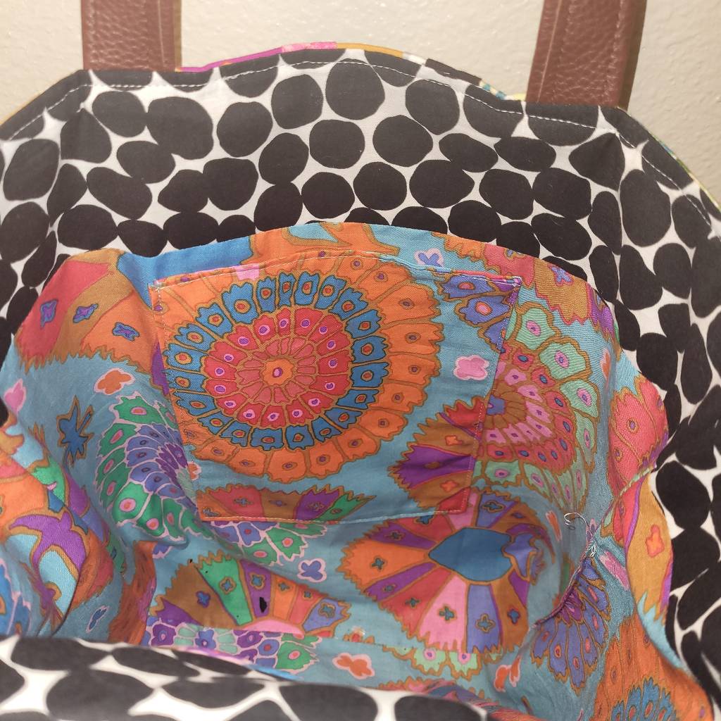 The last bag tonight was made by Linda Allen. I love that she included a printed panel of her pupper! What a happy little dog! And I love the combo of the little paw print fabric with the bright prints! And the lining is perfect.
