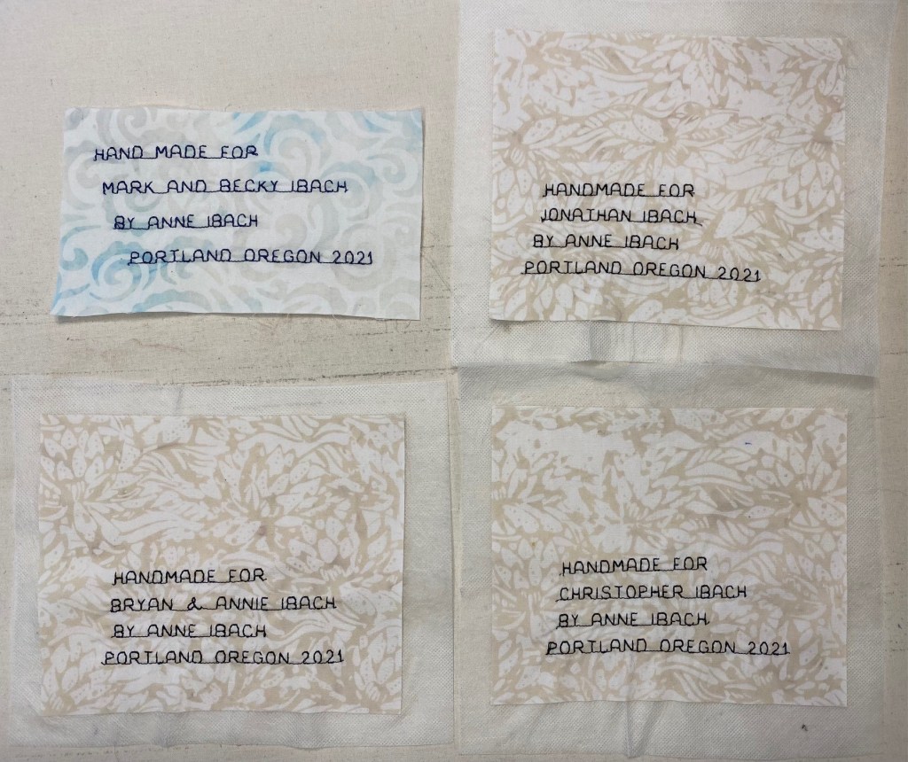 So I had been thinking that I had a couple of options for stabilizing these labels for stitching, and a couple of options for attaching them to the back of the quilts. You really do need to use stabilizer when stitching these labels. Without it you’ll have a puckered mess!