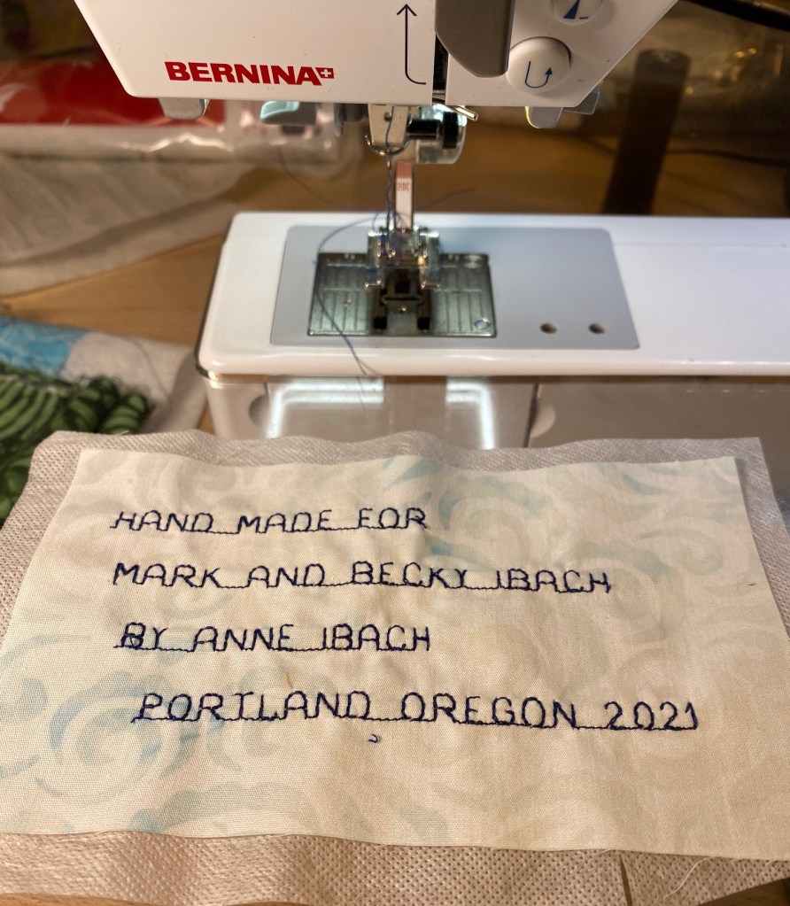 So after our walk, I hit the sewing room and started playing around. I made a label for the quilt I gave to my nephew and his wife for their wedding last summer. That label turned out waaaay too stiff and I wasn’t happy with it.
