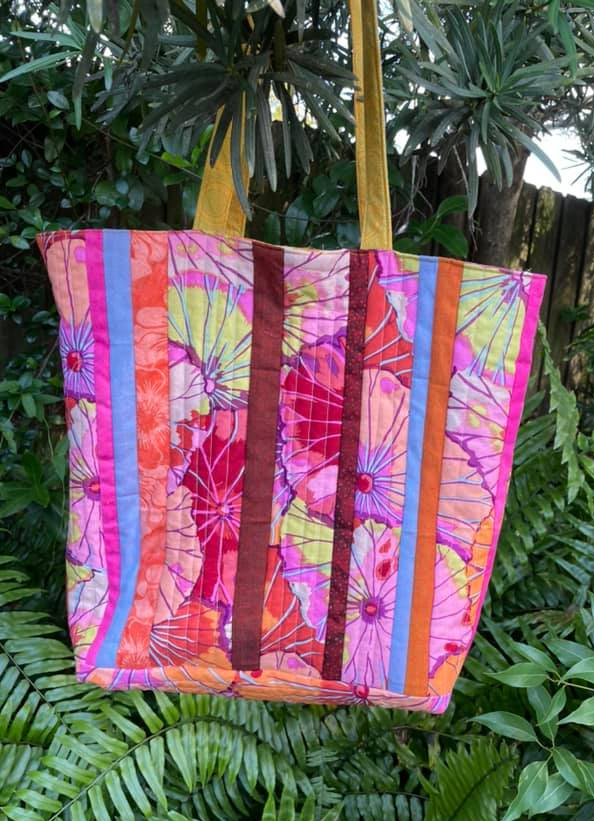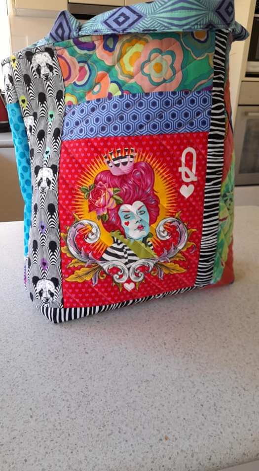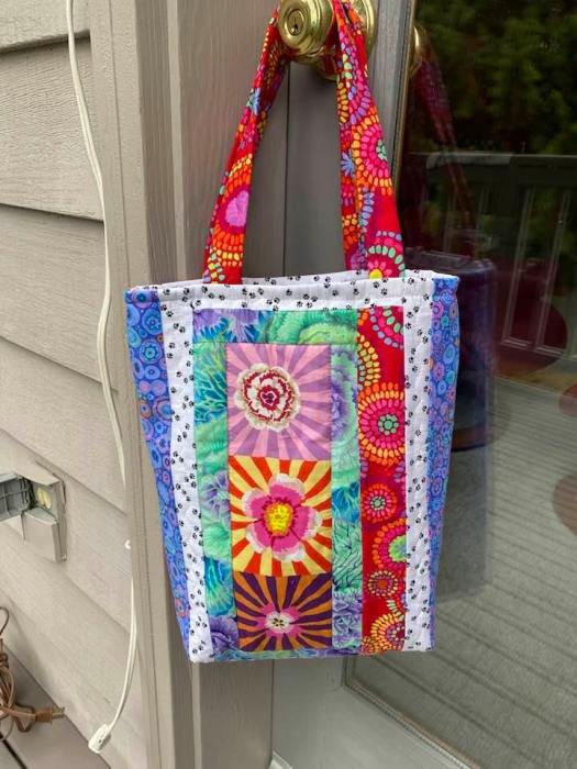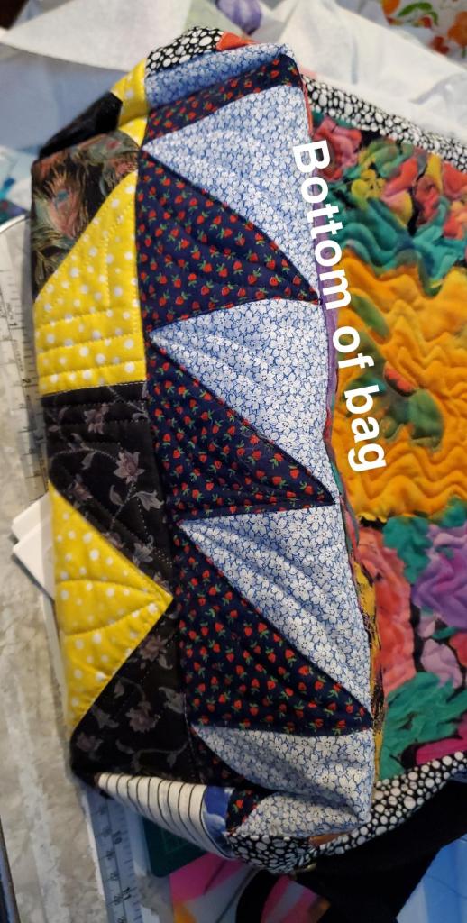 This first one was made by Jan Ballentyne in New Zealand. Jan made this bag from fabrics that were left to her by her dear friend who passed away. She said it took her some time to get to where she could work with the fabrics. She will gift this bag to her granddaughter Lily when they are able to visit each other again.
