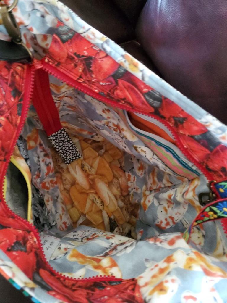 Next is this bag from Valerie Wootton that came in just under the wire for me to get it in this post! She said she didn’t put a pocket in her lining. Instead, she used a purse organizer that fits perfectly in the bottom of the bag. What a great way to reuse something! I love Valerie’s soft purples in this bag. The little geese make me so happy. I also love how the two sides of her bag are different… but they are perfect together.