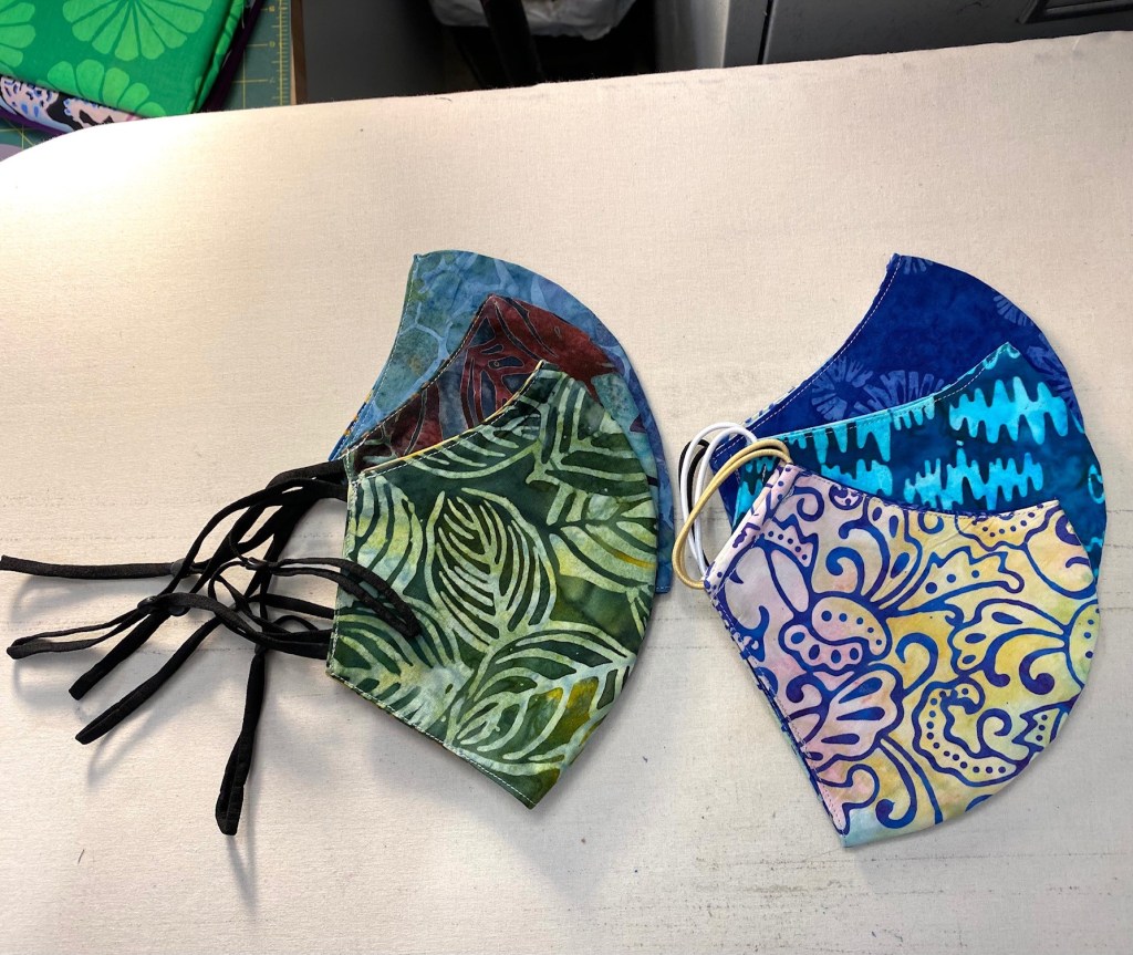 The husband wears hearing aids so has trouble with some masks. He really likes the adjustable ear straps on the masks at the left. All of these masks are made with two layers of batik with one layer of fusible nonwoven interfacing. You can find the pattern for my masks in this blog post. If you make masks, you should give this pattern a try. I’ve made a LOT of different mask patterns and this one fits the best, is really comfy and is really easy to make. Everyone I’ve made them for absolutely love them.