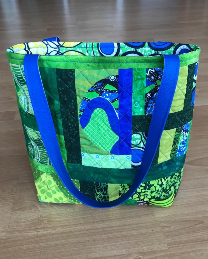 First up is this bag from Sabine Müller-Rückriem from Germany. I just love these bright blues and greens together. She’s also included some cool curved piecing. And I love the peek at what looks like a really good lining!