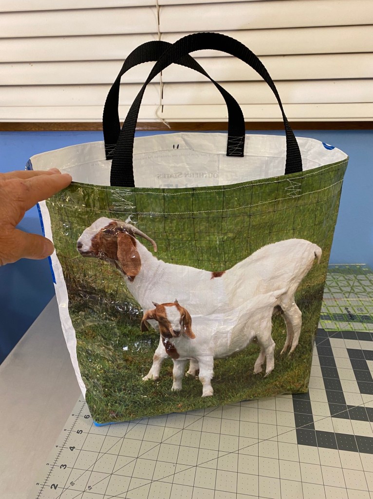 I want to thank the people who pointed out to me that the little white animals on the bag I made last night are not in fact sheep, but actually goats. I knew they were goats. I just hink I had sheep on the brain! I do spend some time around sheep and should be able to recognize one. But maybe not!