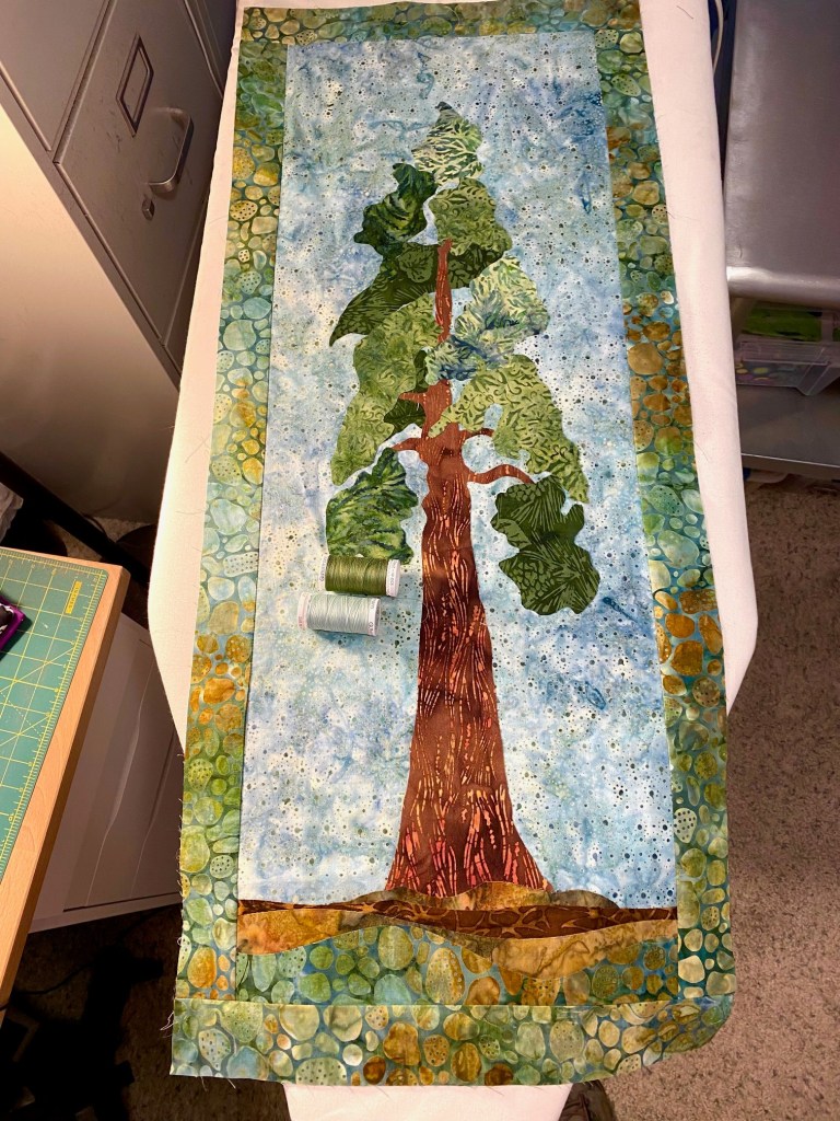The local store that gave away this pattern has a stand of amazing sequoia trees on the property. They had originally done this pattern in wool applique. I translated it into batiks.