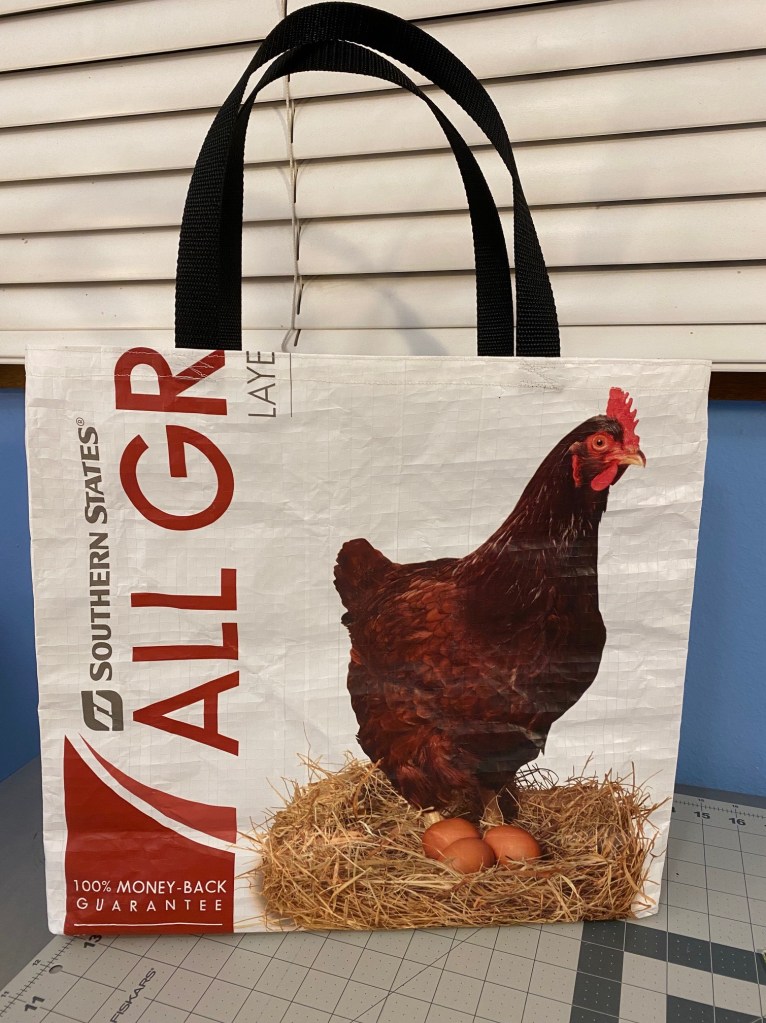 A friend of mine recently bought a property down in Canby, Oregon, and she’s got a newfound obsession with fancy chickens. This means she’s going to have a lot of chicken feed bags. These are sturdy plastic bags that have nylon thread running through the fabric for strength.