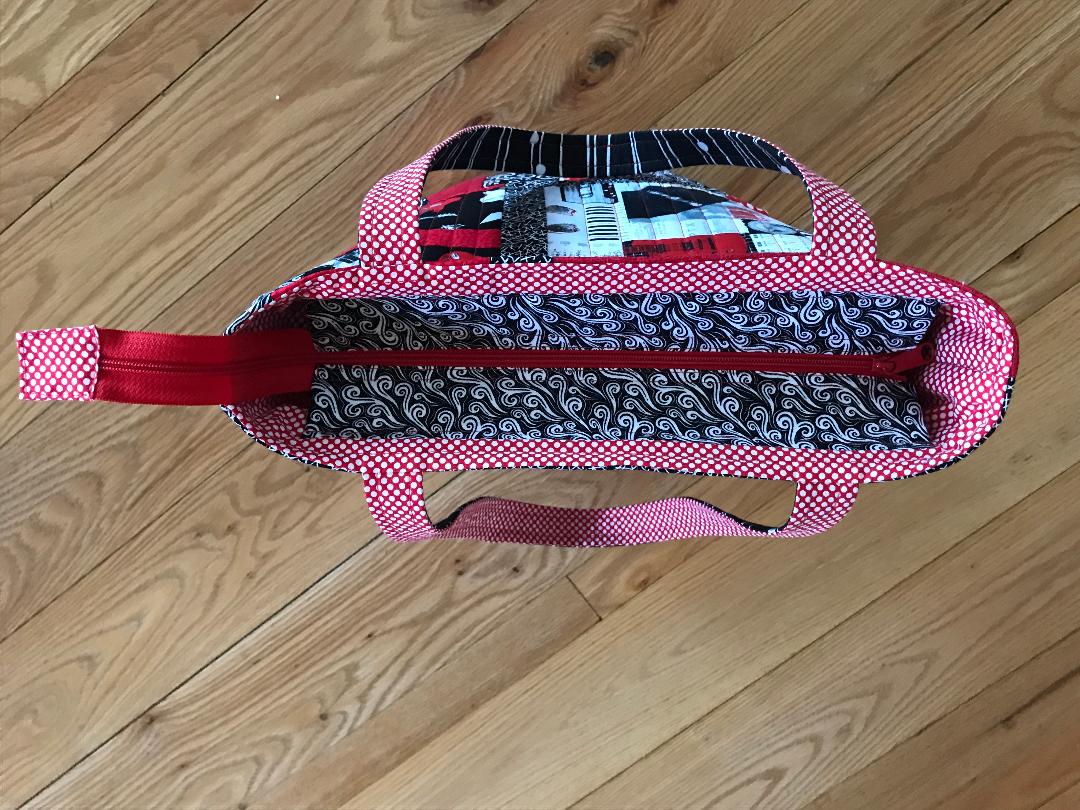 Next up is this bag made by Celia Garcia Goins. She used fabric from a project from a long time ago and doesn’t remember what the fabric is. But it’s fun! I see pineapples and zebras. And it follows along with tonight’s theme of red, black and white! I love her wonky angles and big pieces.