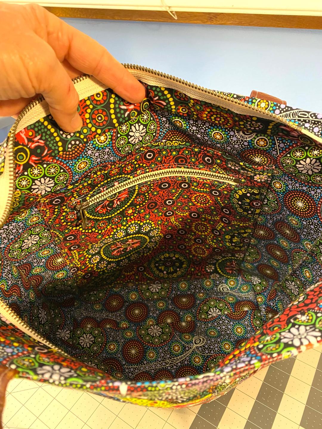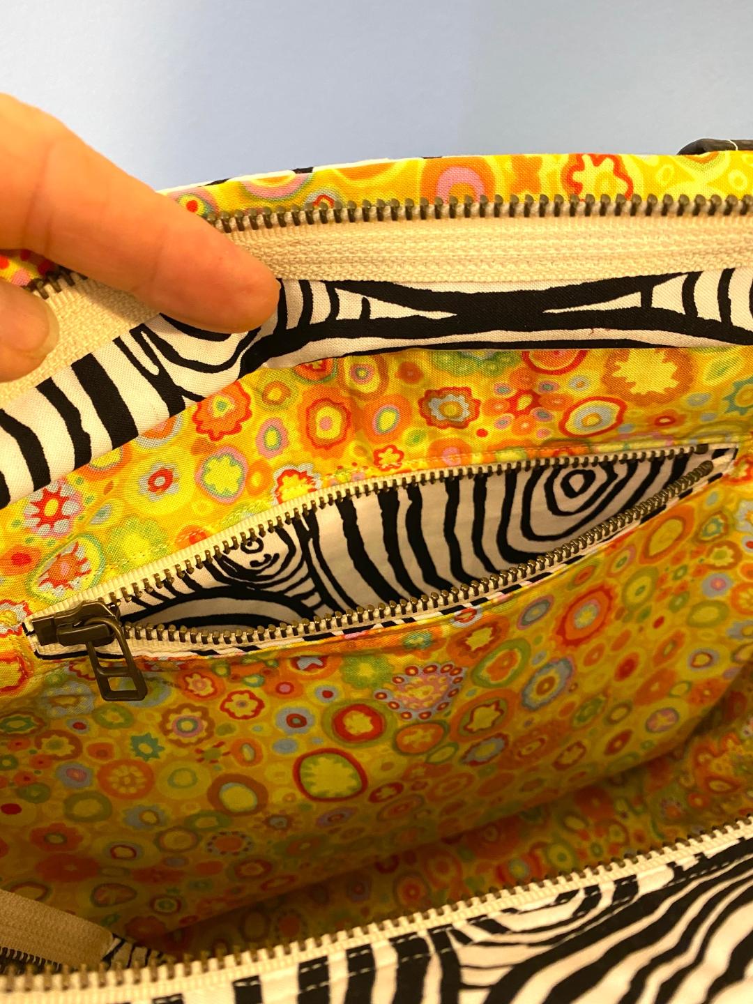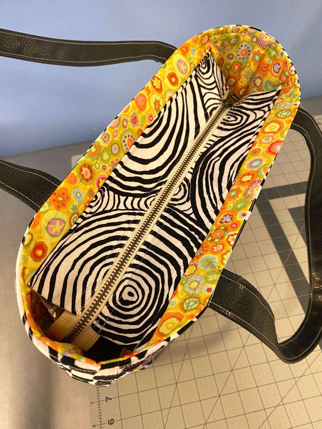 I just love that onion rings fabric for the inside of that zipper pocket! What a fun pop of graphic bliss! And this simpler zipper pocket is much better than the more complicated one I made in the Aboriginal fabric bag I finished a few days ago. I will use this more simple approach in future bags.