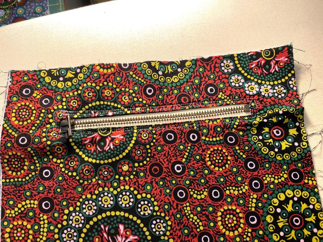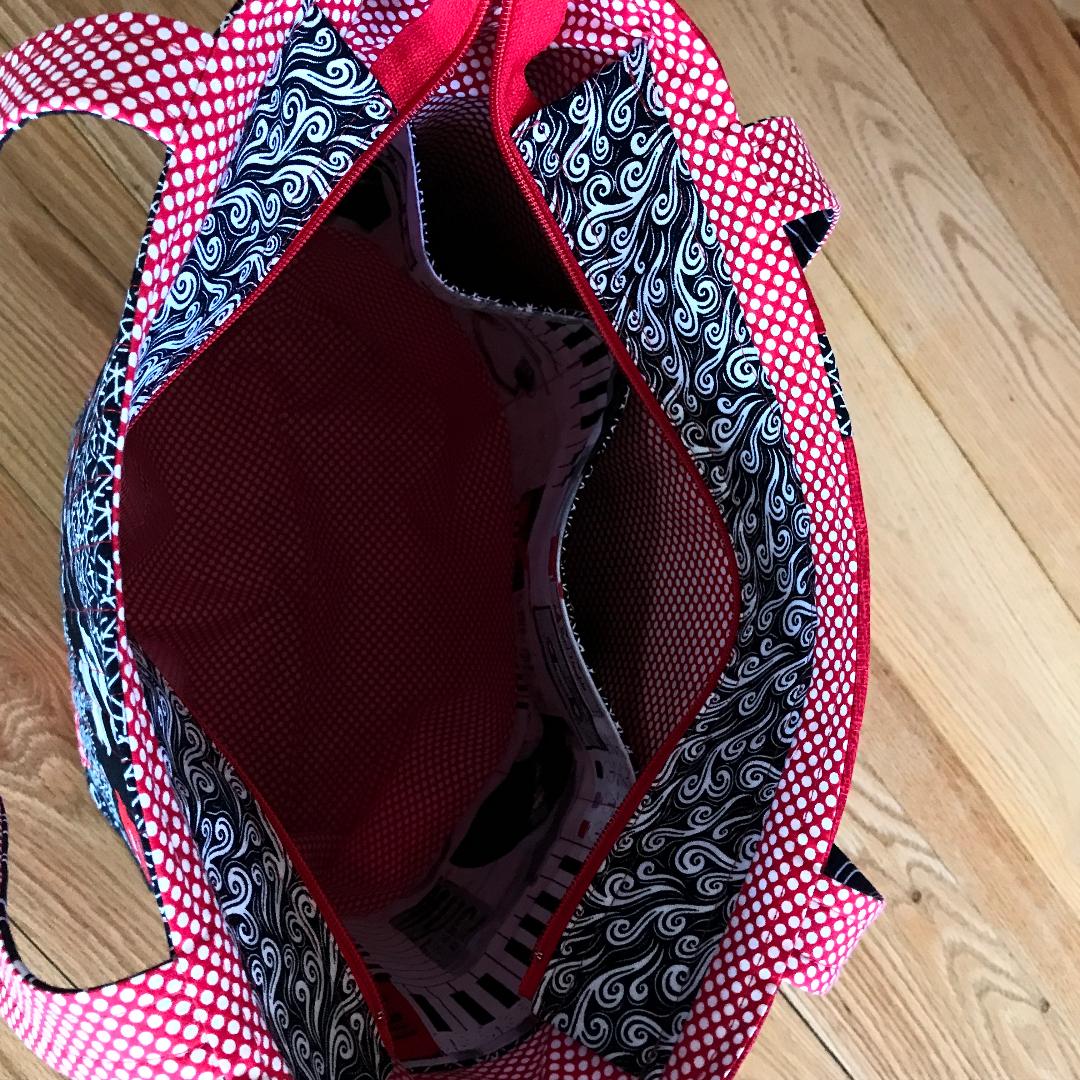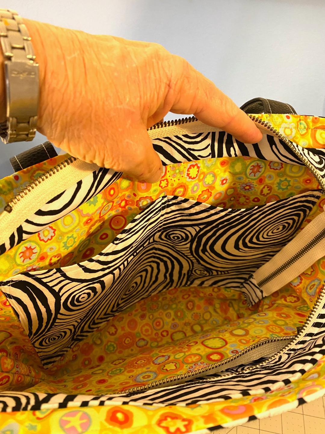 I just love that onion rings fabric for the inside of that zipper pocket! What a fun pop of graphic bliss! And this simpler zipper pocket is much better than the more complicated one I made in the Aboriginal fabric bag I finished a few days ago. I will use this more simple approach in future bags.