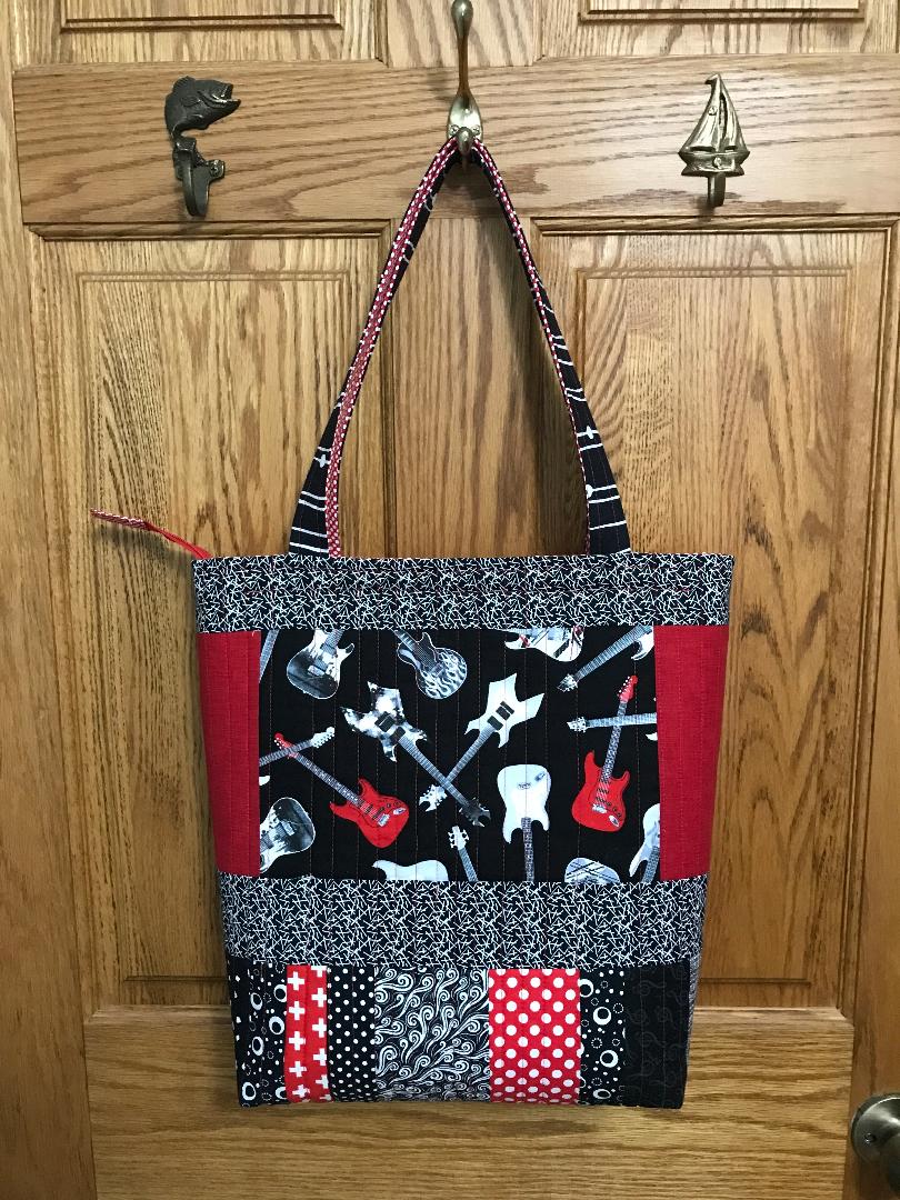 A few more blog readers sent me photos of Frankenbags over the last few days. This first one was made by Kim Bates. She made this for a guitar-loving friend of hers. I love the black, white and red, and this bag looks really well made. That big piece of the guitar fabric is really fun! What a great bag for a musician!