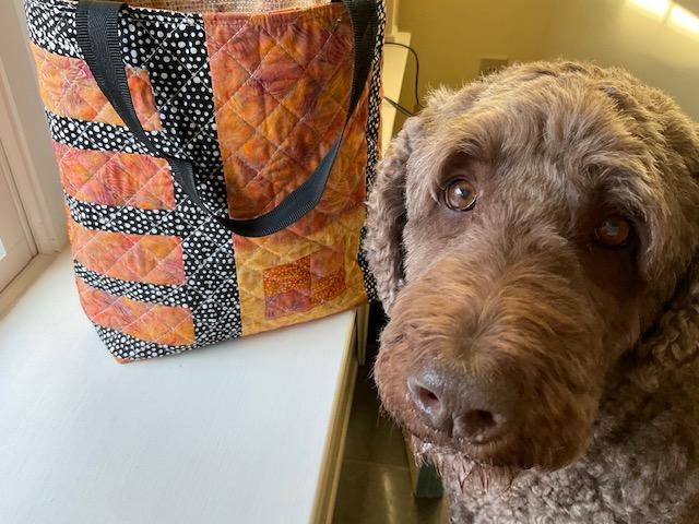 The next bag comes to us from Elfi Read. If you look carefully you’ll see that the big block is a junkyard dog… It’s so cute!!! It’s just such a fun bag. And I love orange. It gets a really bad rap, but it’s an amazing color! And you’ll also see Elfi’s special walking partner who makes that bag look even better!