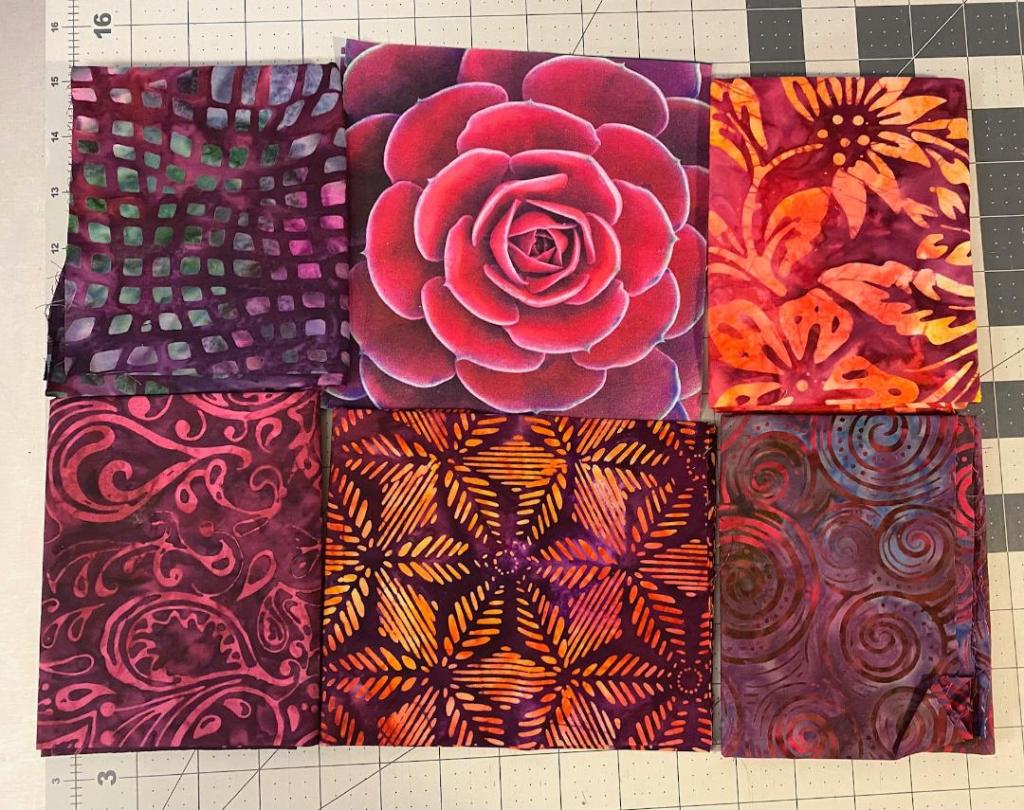 So, with that project on the back burner, I decided that I would start working on the panels for another bag featuring a succulent panel. I selected one of the succulents and dug into my batik fabrics and here’s my initial fabric pull.