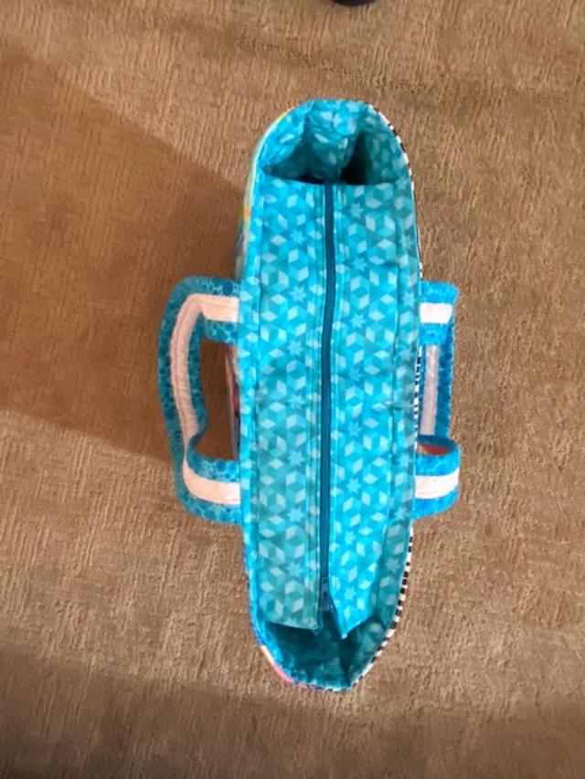 First up is this bag made by Sue Everett. I really like this bag… the bright fabrics, the graphic black and whites. the strong lines. It’s just a really fun bag. Unfortunately, something odd happened with Sue’s email and some of the photos didn’t come through. she used a striped zipper (that I can share with you) and used fusible fleece on the lining too, to add even more structure. Beautiful bag.