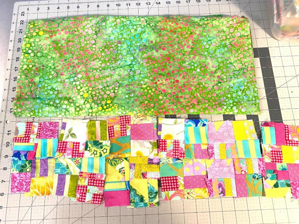 My friend that I’ve made this for wanted it to be pink and green. So the first thing I did was dig out some blocks that a friend gave me and sorted out a few that were mostly pink and green. Then I cut those blocks into smaller pieces and reassembled them with some crumb piecing.