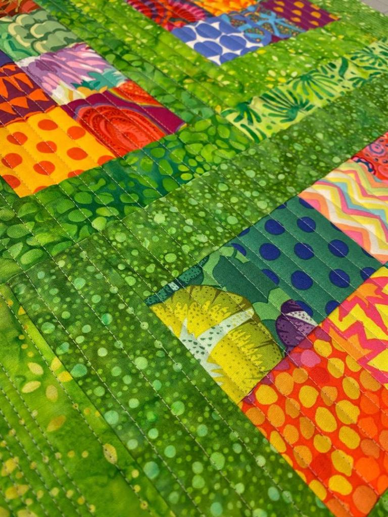 I wasn’t sure how the green batiks would work with the KFC scraps, but I really like it. The reds really pop with all the green. There’s a reason… check your color wheel!