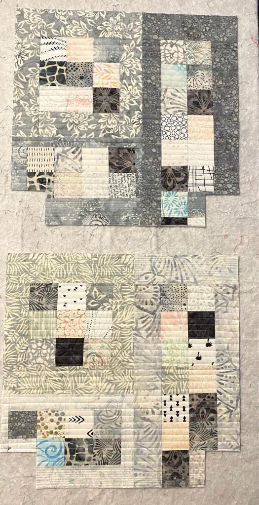 Then I added strips to each of these pieces, measured, trimmed, and sewed them into two panels. One turned out darker…