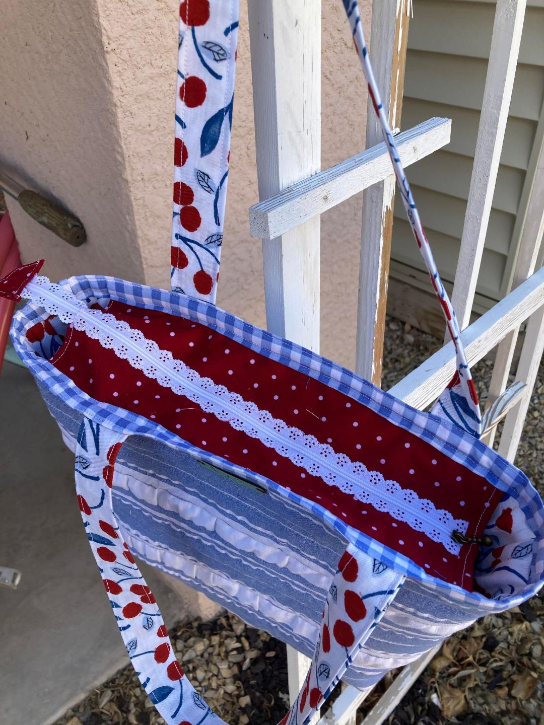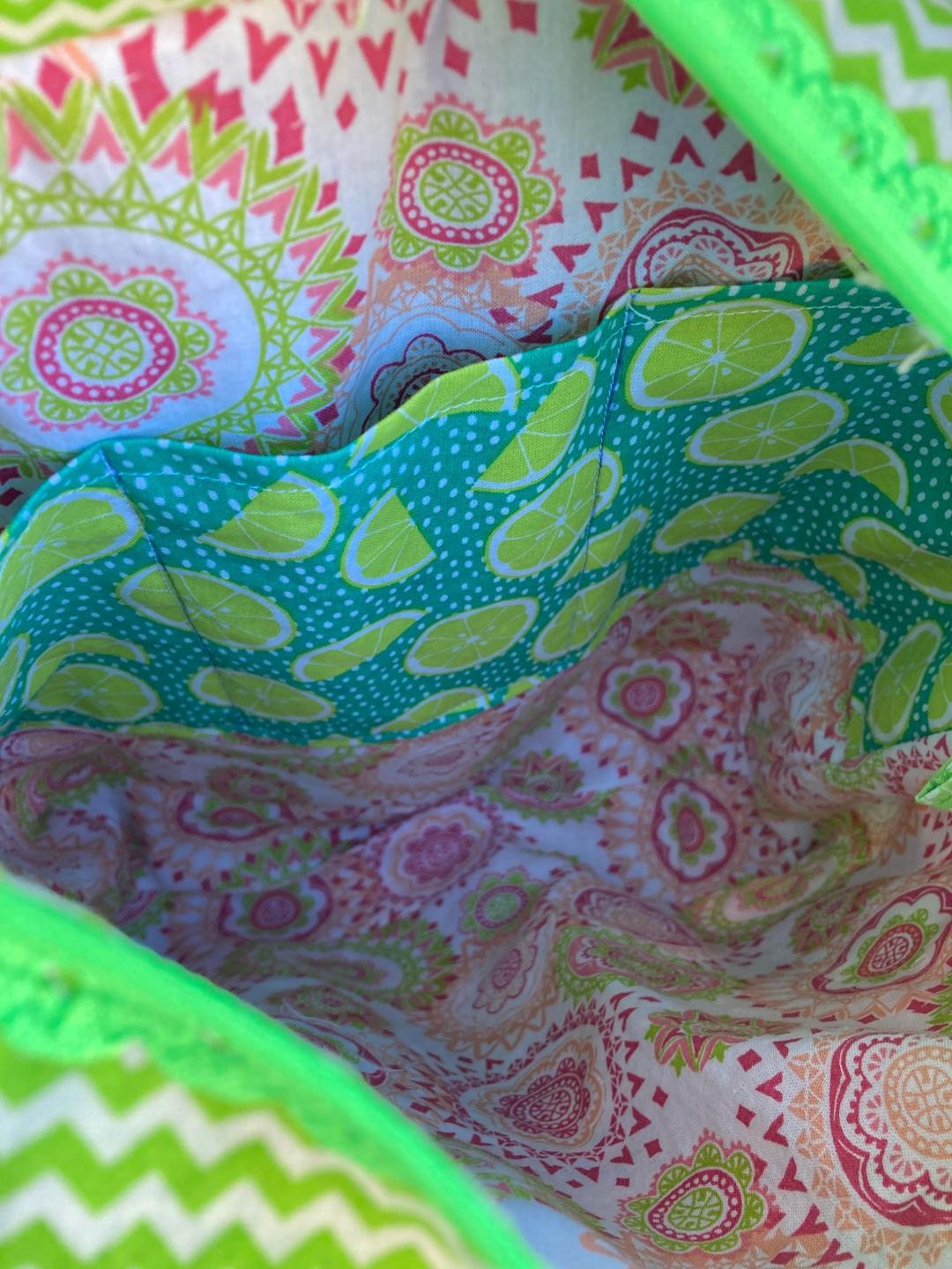 Next up is this bag made by Marlene Lennox. This is also her first Frankenbag. She said she found the interior challenging, but kept with it and finished it. This is a gift for her grand daughter and I think she’ll love it with all those bright and scrappy fabrics!