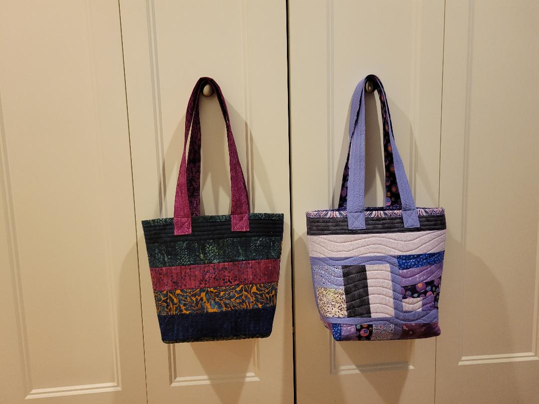 This next bag is from Nancy Kelly. The bag on the left was made before she found my Frankenbag tutorial. The second bag was made from my tutorial. I love the purples she used and the wavy quilting is really fun.