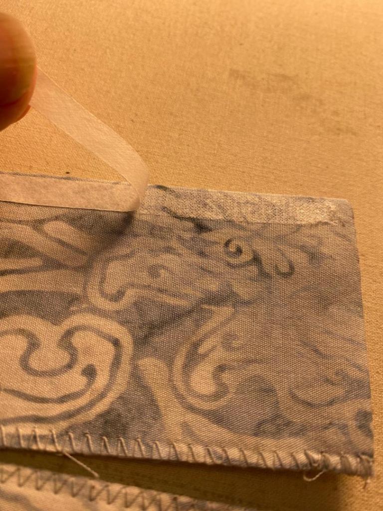 Then, with the paper still on, as the photo shows, I hit it with my iron to fuse the webbing to the zipper tape. Then I peeled off the paper and centered the zipper pocket opening over the zipper and used my fingers (not the iron) to press the fabric of the pocket opening onto the adhesive. Then I hit it with my iron to fuse the webbing to the pocket opening.