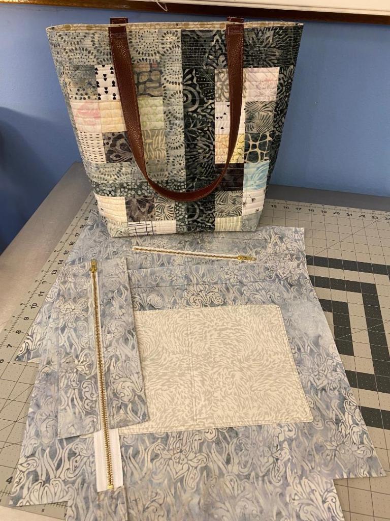 So, I did get a lot done on this second Ice Storm bag tonight. I got both quilt panels sandwiched and quilted and I got the handles made and the body of the bag constructed.