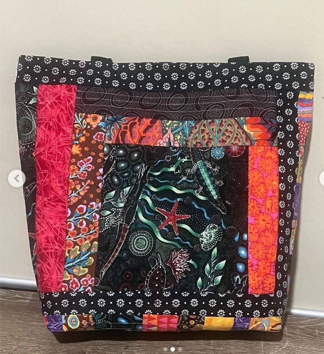 I have one more Frankenbag from reader Allanah Lewis to share with you tonight. And interestingly, she’s combined some aboriginal fabric with some KFC fabrics! Along with some other pieces. I love the way she left the Aboriginal fabric in a large piece. The colors are good too.