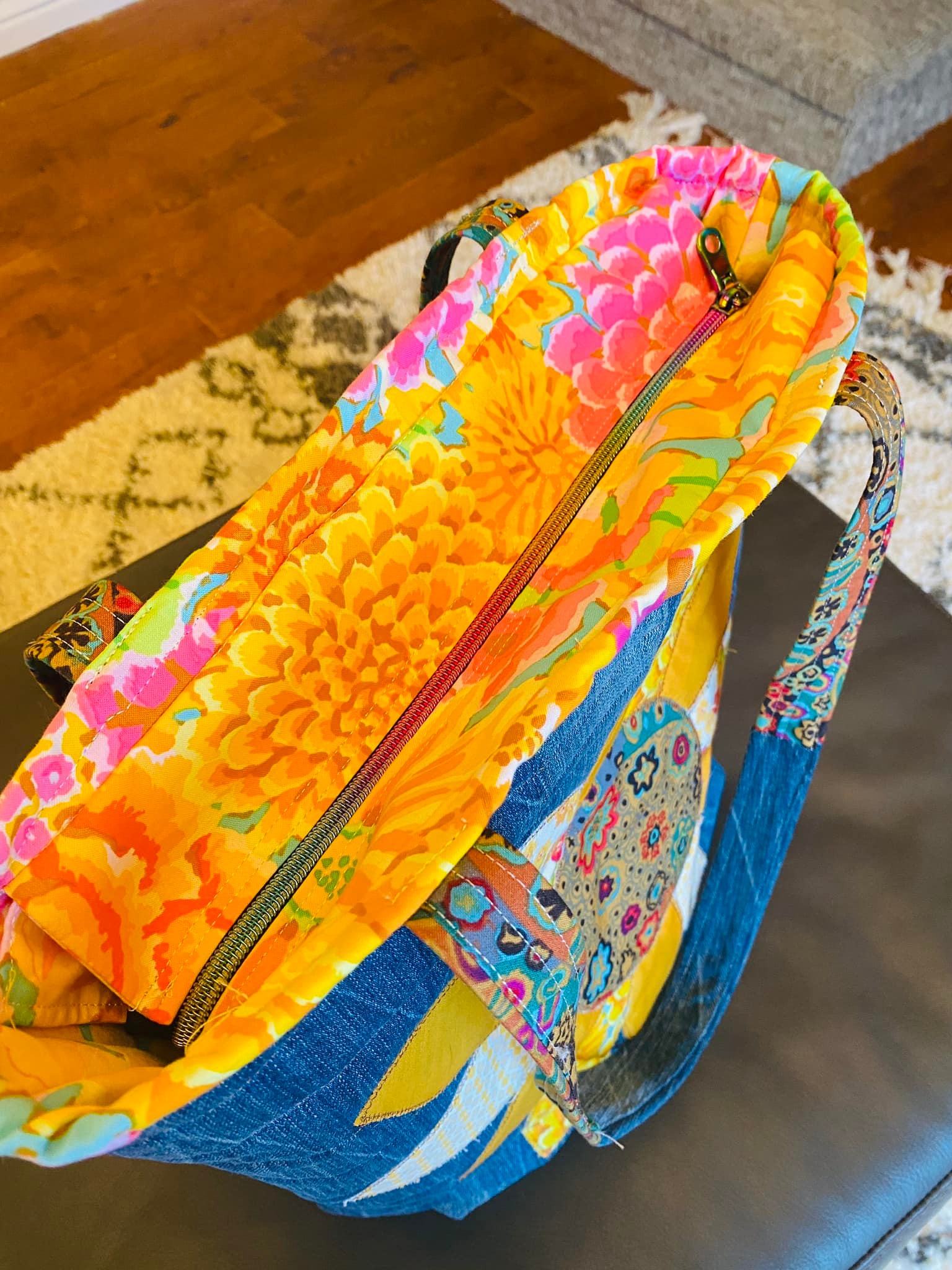 She made an adorable upcycled denim bag with a giant yellow sunflower appliqued on it.