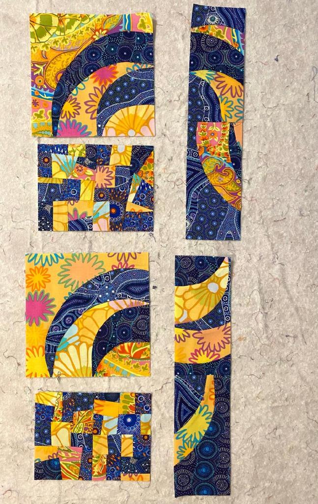 I have all the block elements for the second panel done. I just need to put them all together with the blue Aboriginal fabrics.