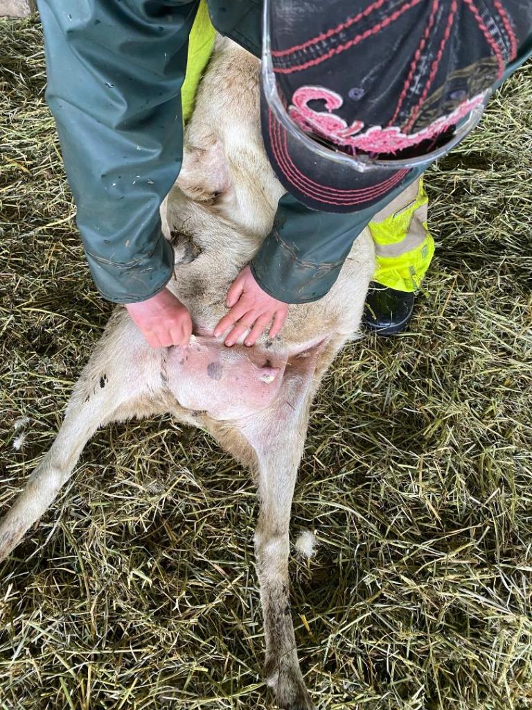 And Trudy has to treat the ewe with the chapped udder. Here she is putting Bag Balm on the ewe.
