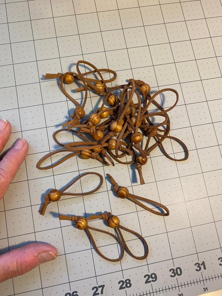 I had a few minutes earlier in the day and decided to make some zipper pulls so I would have them on hand when I finished some upcoming bags. So I dug out some brown faux leather strips that matches my tags and got to cutting, tying and pulling.