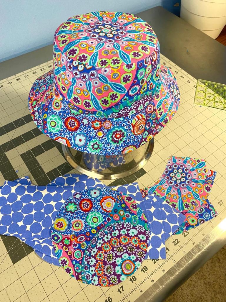 Oh my goodness! That aqua millefiori is so amazing! I don’t typically love the look of fussy cutting and rarely do it, but I did fussy cut the top of this hat and I’m glad I did. It’s so cool! If you look at the top piece sitting on the table, you’ll see it’s NOT fussy cut. I didn’t have enough fabric to fussy cut both. And I do love the more random look of the one on the table!