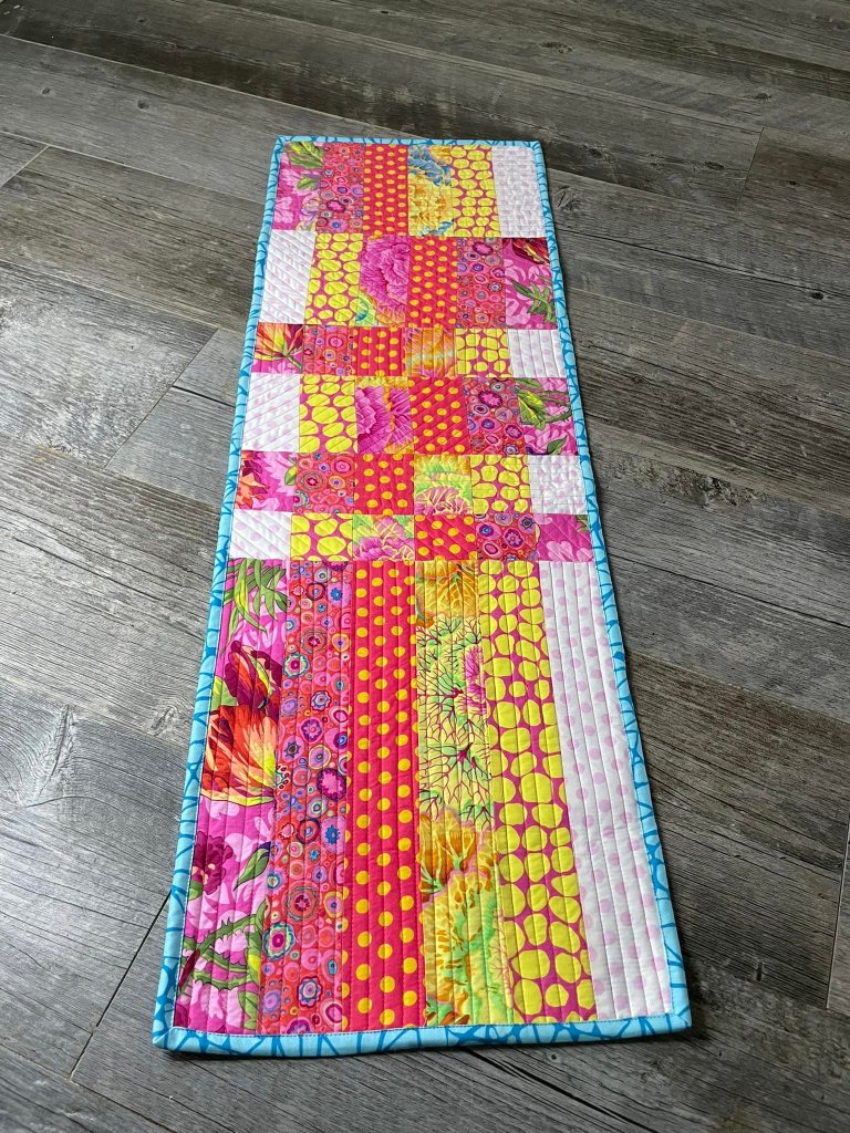 I saw this table runner on Facebook today and it gave me an idea. It was made by Stefanie Wolicki Jarrell. She made a strip set and then cut the set into different width pieces and then reassembled them.