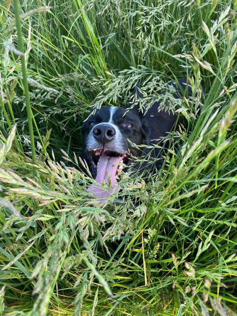 Finished up work at 5:00 today, hurried and grabbed some dinner and then hit the road for Rico’s agility lesson. I got there a little early so let the boys have a nice run on the edge of my friend’s grass seed field. The grass grows by a foot every week! Rico and Bender just disappeared out there! You can see that they’re both covered with seeds.
