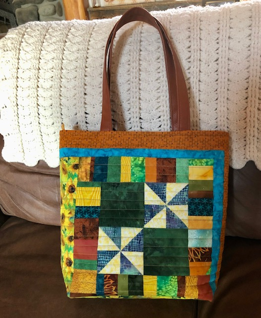 These next two bags were made by Cindy Jahn Thomas. She said, “I finally made time to make one using a couple pinwheel orphan blocks. I didn’t especially like the completed bag initially but it has grown on me. Learned a few things—inside pocket placement (too high for my liking on this bag) an” d to not place a focus block or design element too low on the panel.” I just love that each project can be an opportunity to learn! I love all those little pinwheels and stars! Looking forward to what Cindy makes next