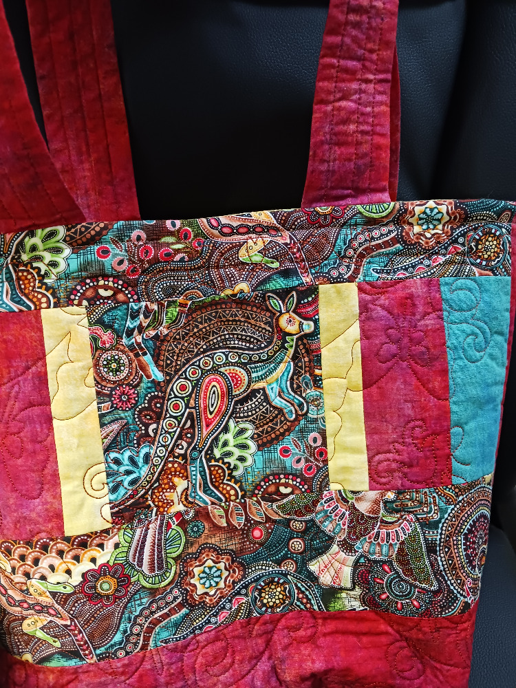 “I used Gondwana by Oasis fabric designs and Grunge for Moda. I did fussy cut because I love the Australian animals and wanted to show case them. Also my 1st time to applique – hearts. This bag goes to my fabulous step daughter who loves anything quilted and animals of all kinds.” What a great gift for someone special! She did a great on on her aplique and her quilting is really fun.