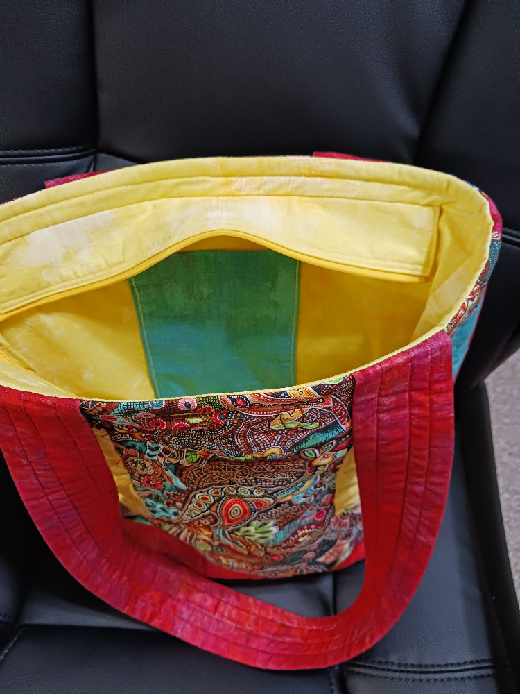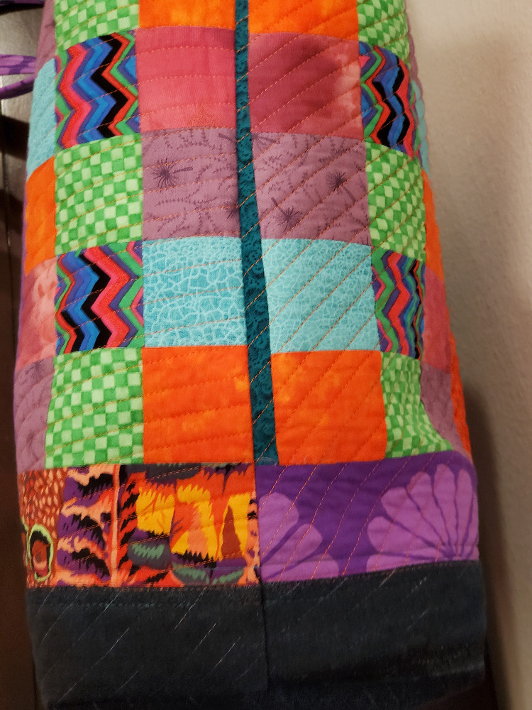 And finally, this bag made by Sara Rajagopalan. She went all out and made a curve pieced block for one side of her bag. And look how she quilted it! it’s so perfect with that curved block. She’s used some really fun fabrics and she’s done a really nice job making it, including two roomy zipper pocket on the inside and a zipper placket.