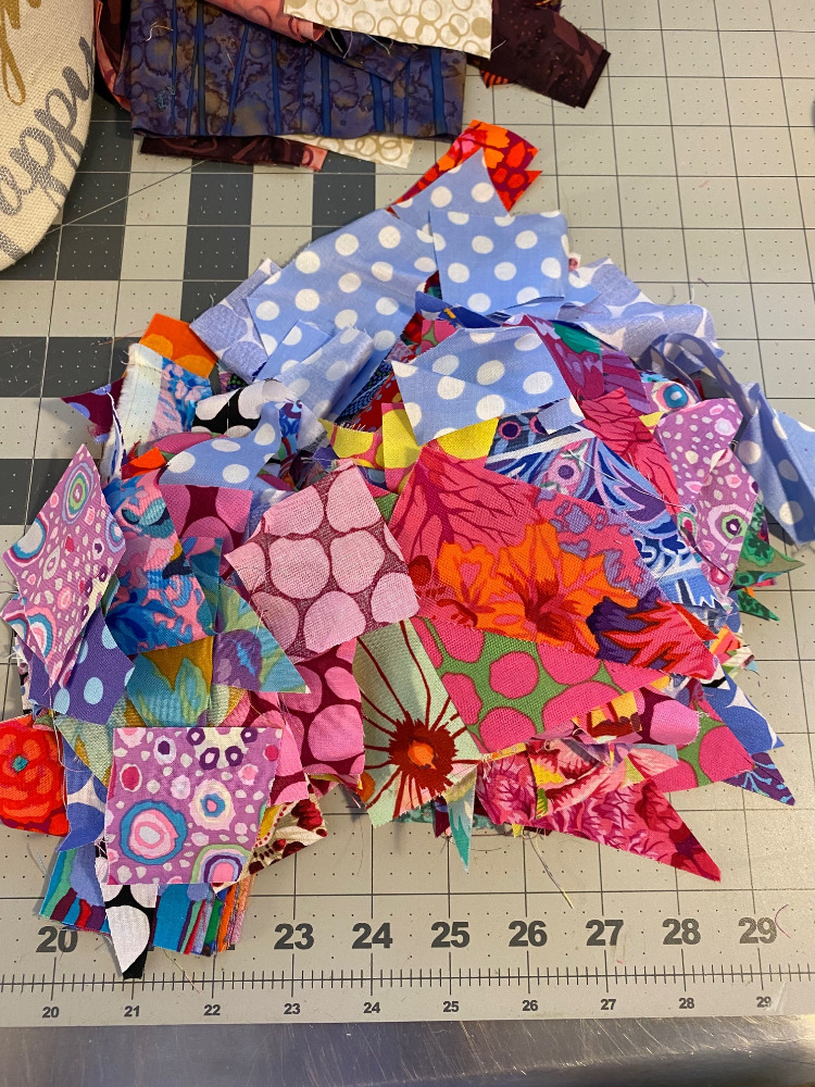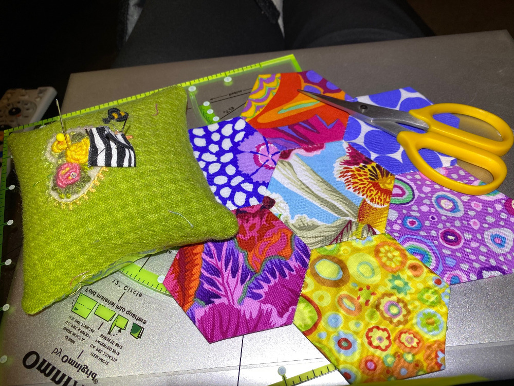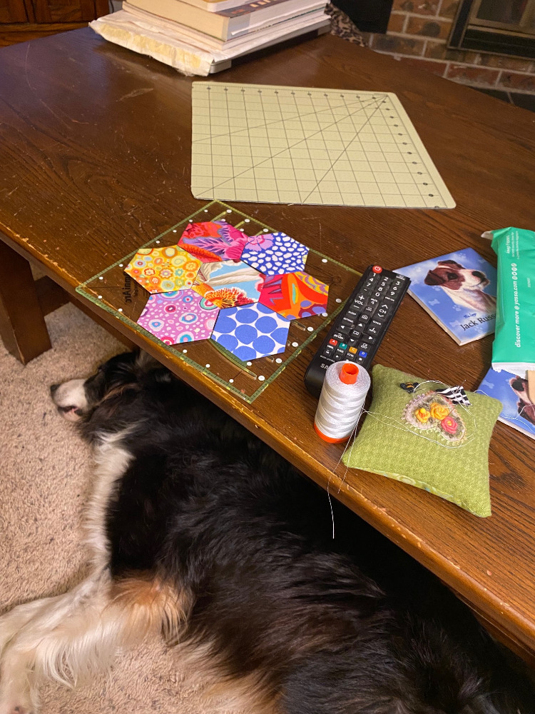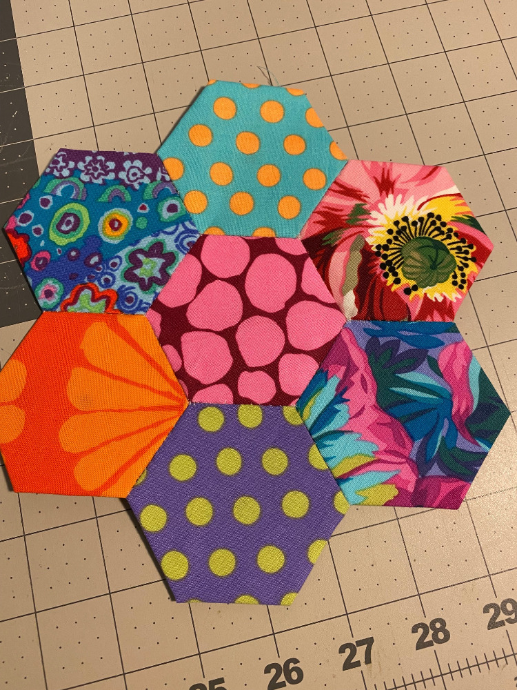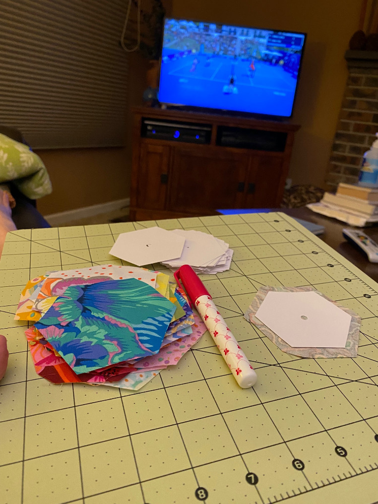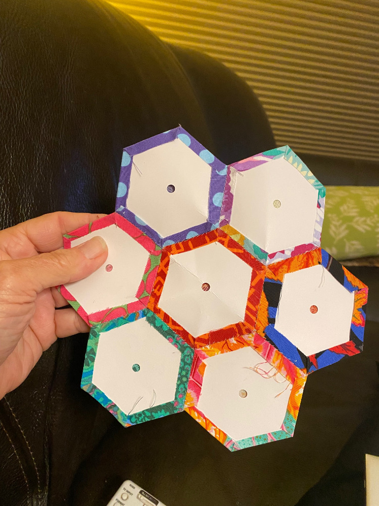 After our walk tonight I had told myself that I would quilt the dark KFC Frankenbag panels I’ve been working on. But that just didn’t happen. With all this heat I felt a little worn out so I turned on the TV and stitched up another hexagon flower.