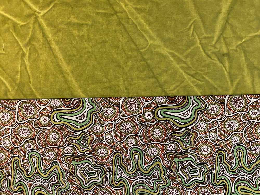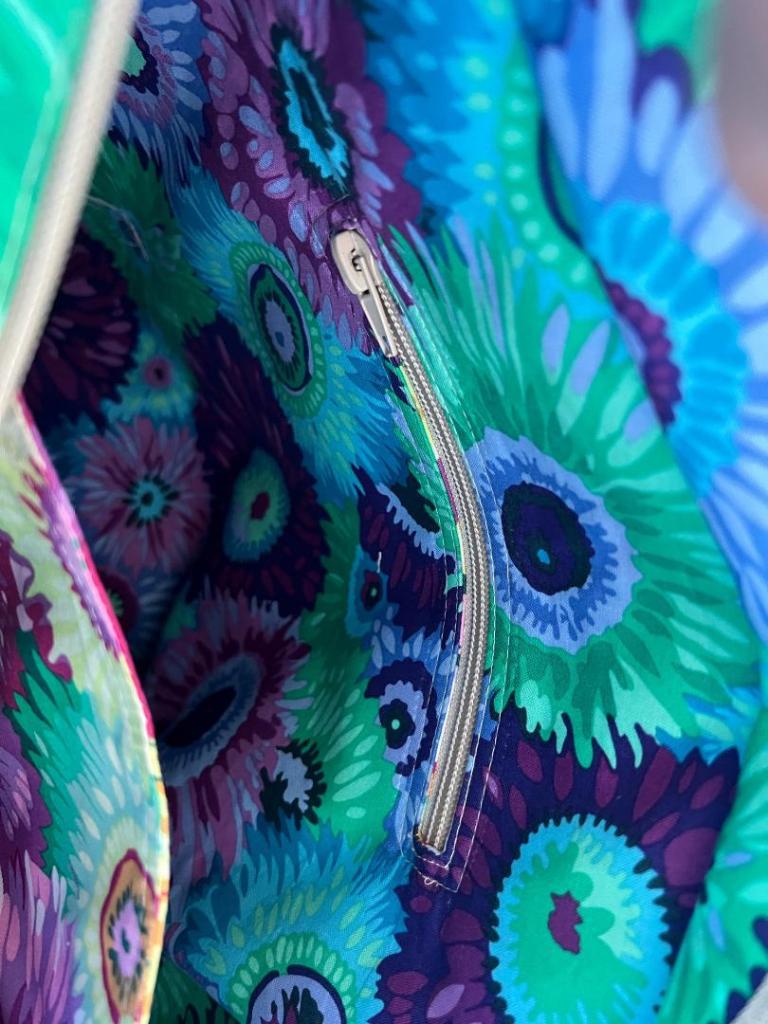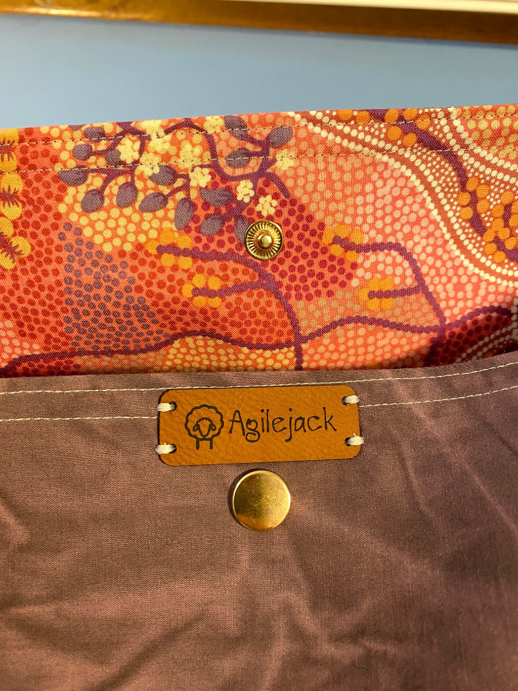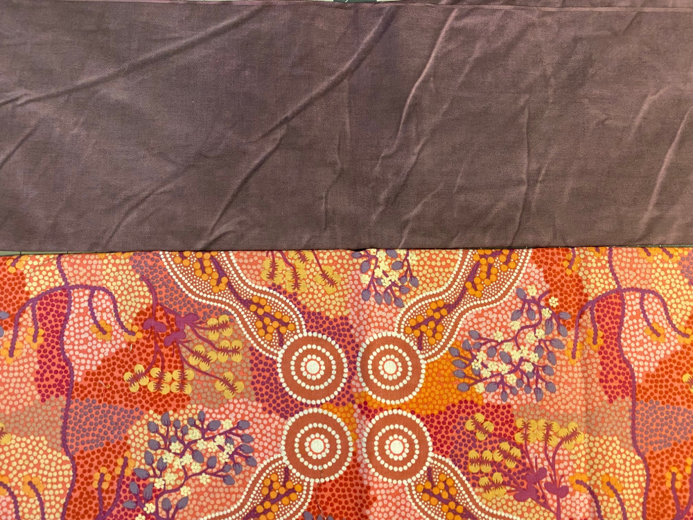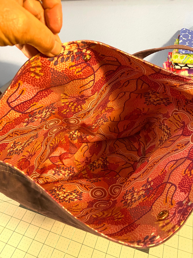 I decided to go with this pretty Australian Aboriginal fabric for the lining. It’s sort of peach and pink with little bits of that purple here and there.